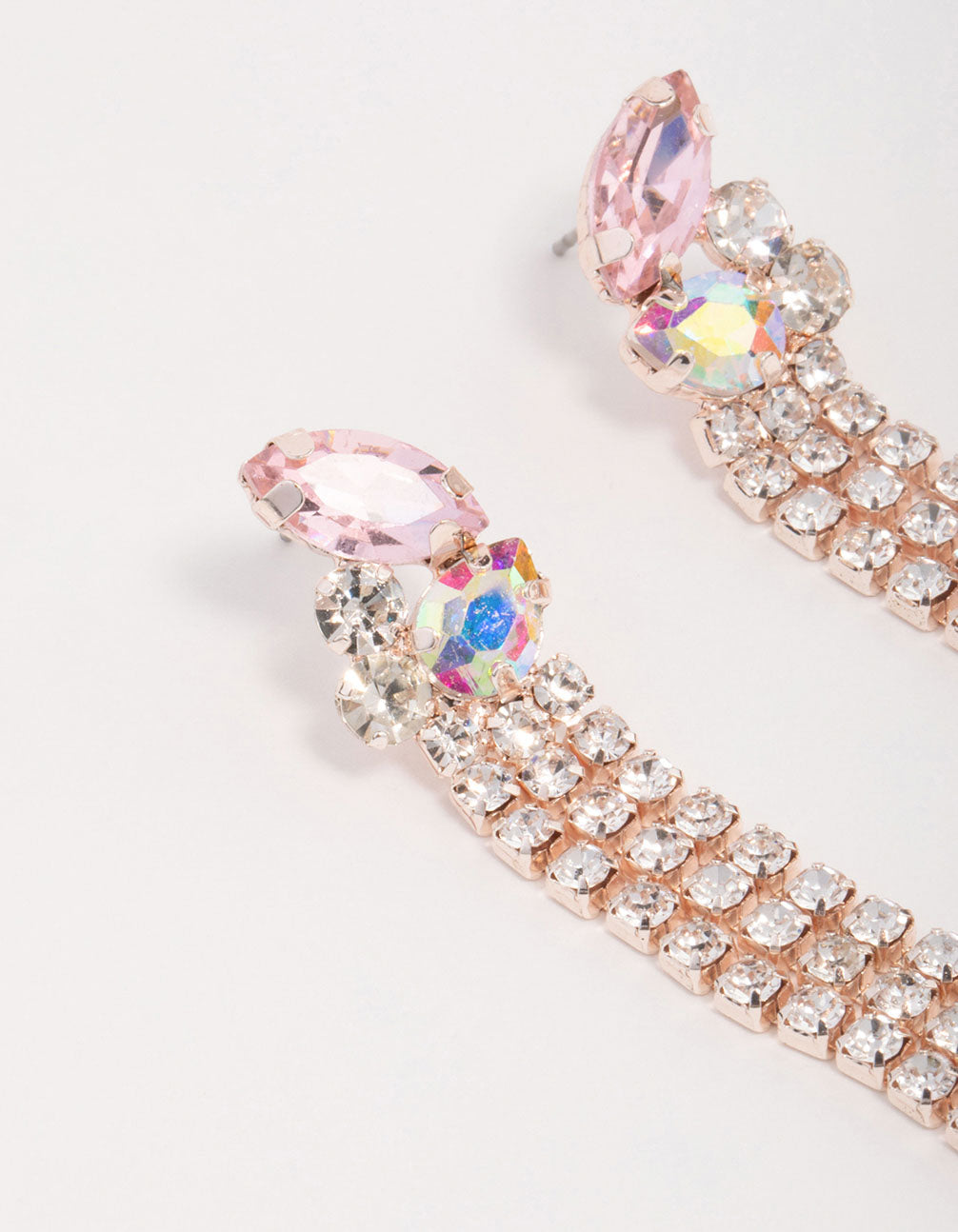 Elevate your outfit with these lovely, rose gold drop earrings. These unique drop earrings feature a cascading design of diamantes, adorned with butterfly wings for an ethereal touch.