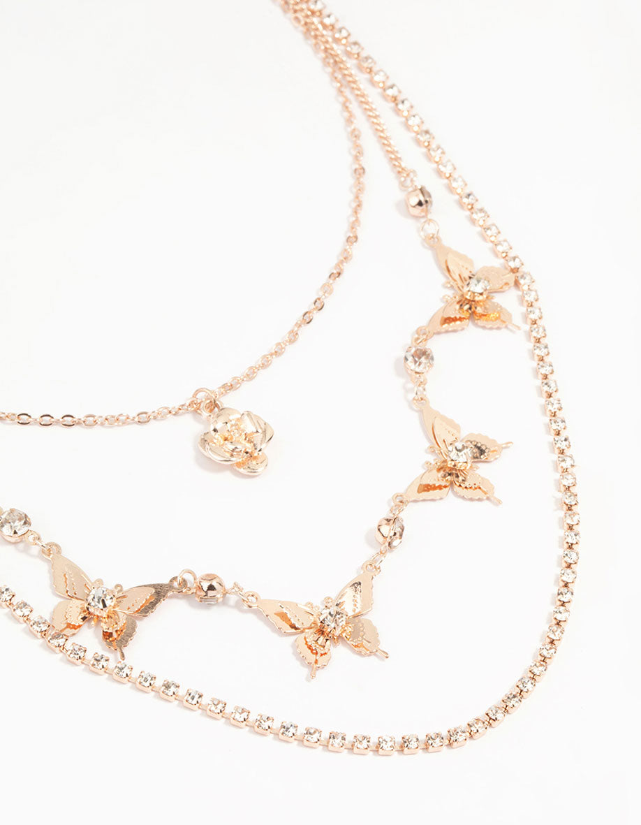 Rose Gold Butterfly & Flower Layered Necklace