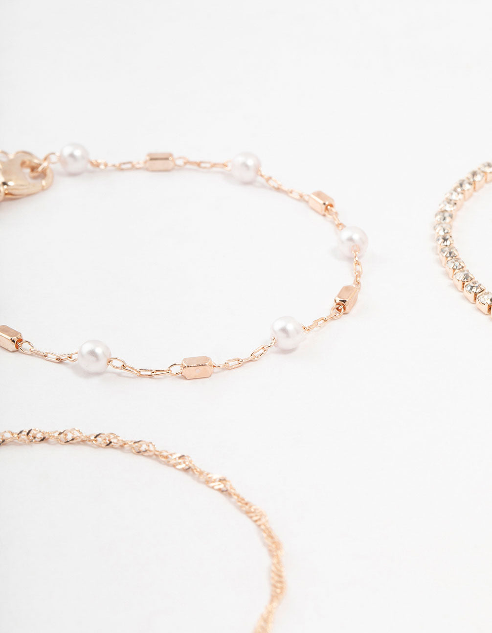 Elevate your wrist game with this set of four bracelets and anklets. Includes a sparkly tennis bracelet, a pearl and rose gold ball piece, a fine rose gold chain with pearls, and a sleek plain chain. Mix, match, and stack to personalize your style.