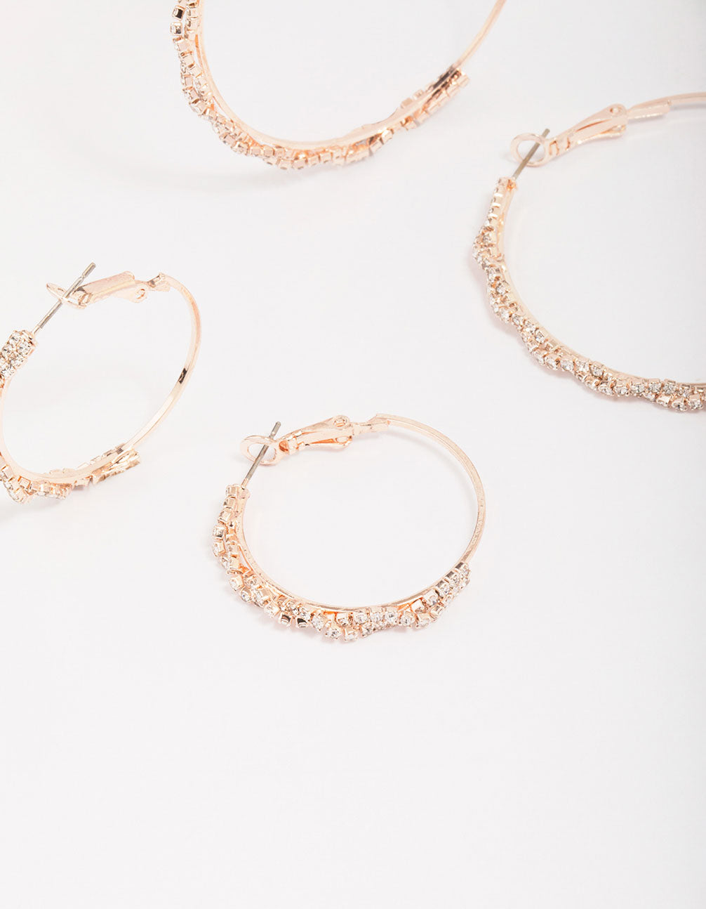 Create your dream stack with this rose gold earring pack. This pack includes three pairs of rose gold hoop earrings in varying sizes, each encrusted with clusters of diamantes for a touch of glamour.