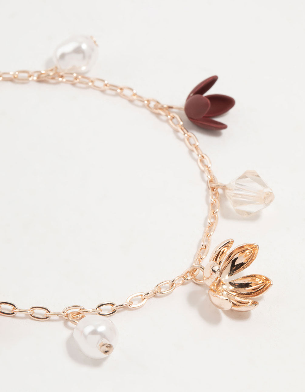 Add some floral glam to your look with this rose gold toned bracelet. This bracelet features different coloured flowers, pearls and bead charms for a gorgeous look.