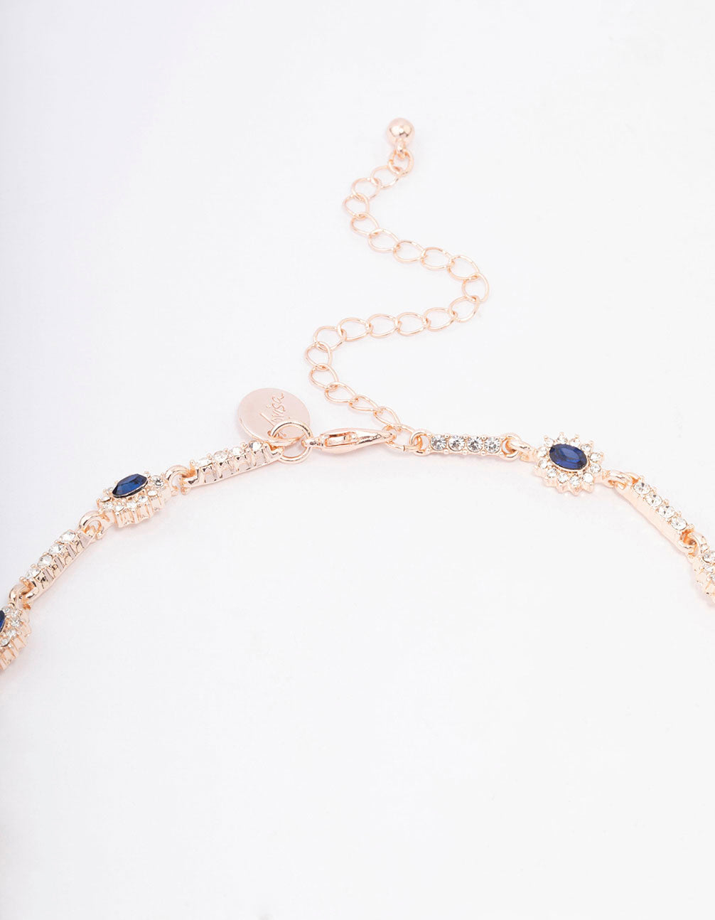 This set contains a decorative pendant necklace and pair of dazzling drop earrings. Each are adorned with sapphire-coloured diamantes for a sophisticated finish.