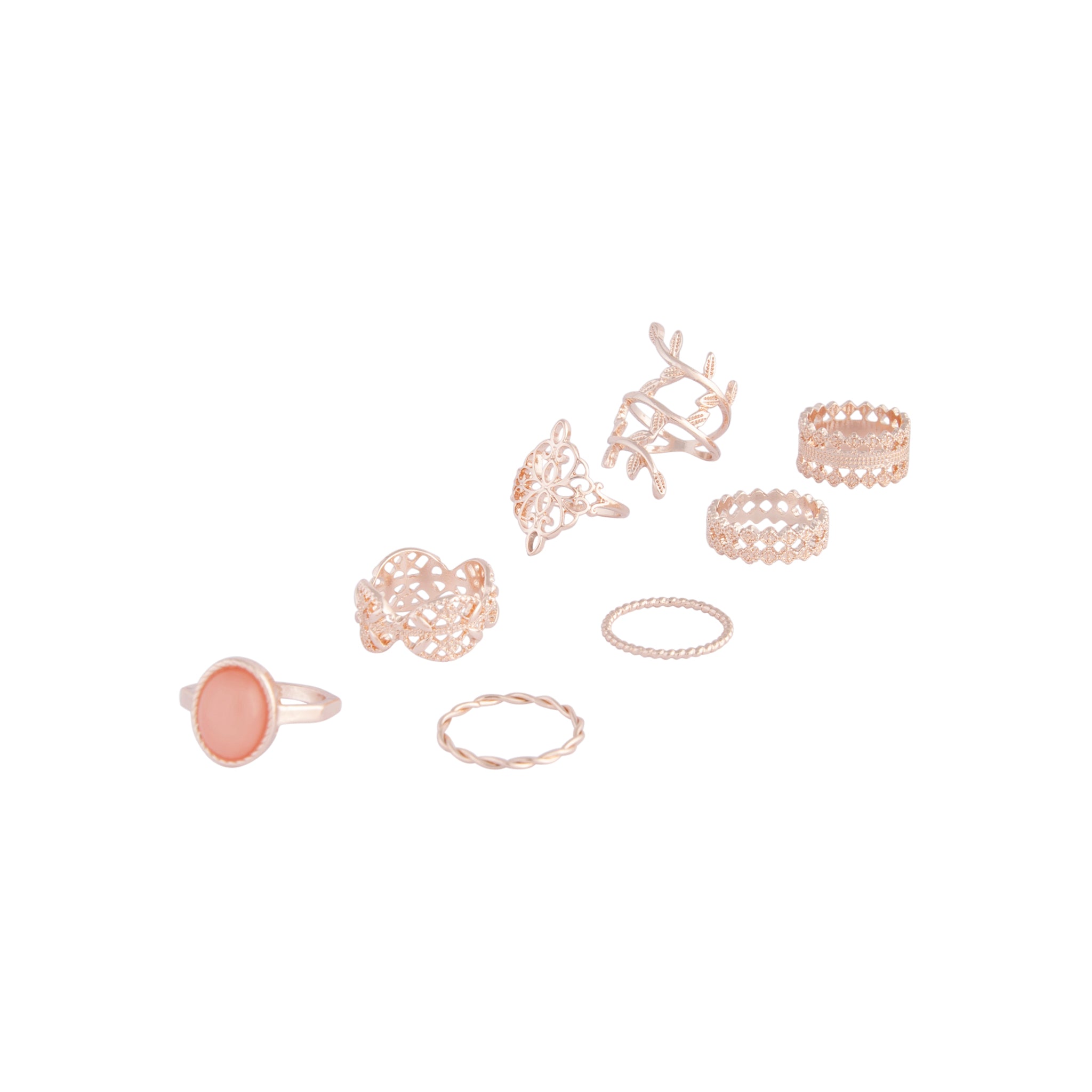 A pack of 8 rose-gold-toned rings with ornate nature inspired designs.