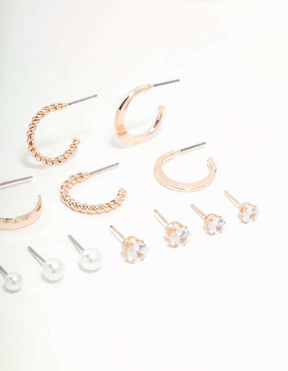 Upgrade your style with this fabulous set of 8 earring styles. Choose from rose gold toned sleek, molten, twisted hoop designs, elegant pearl studs, and diamante studs to create a stunning look.