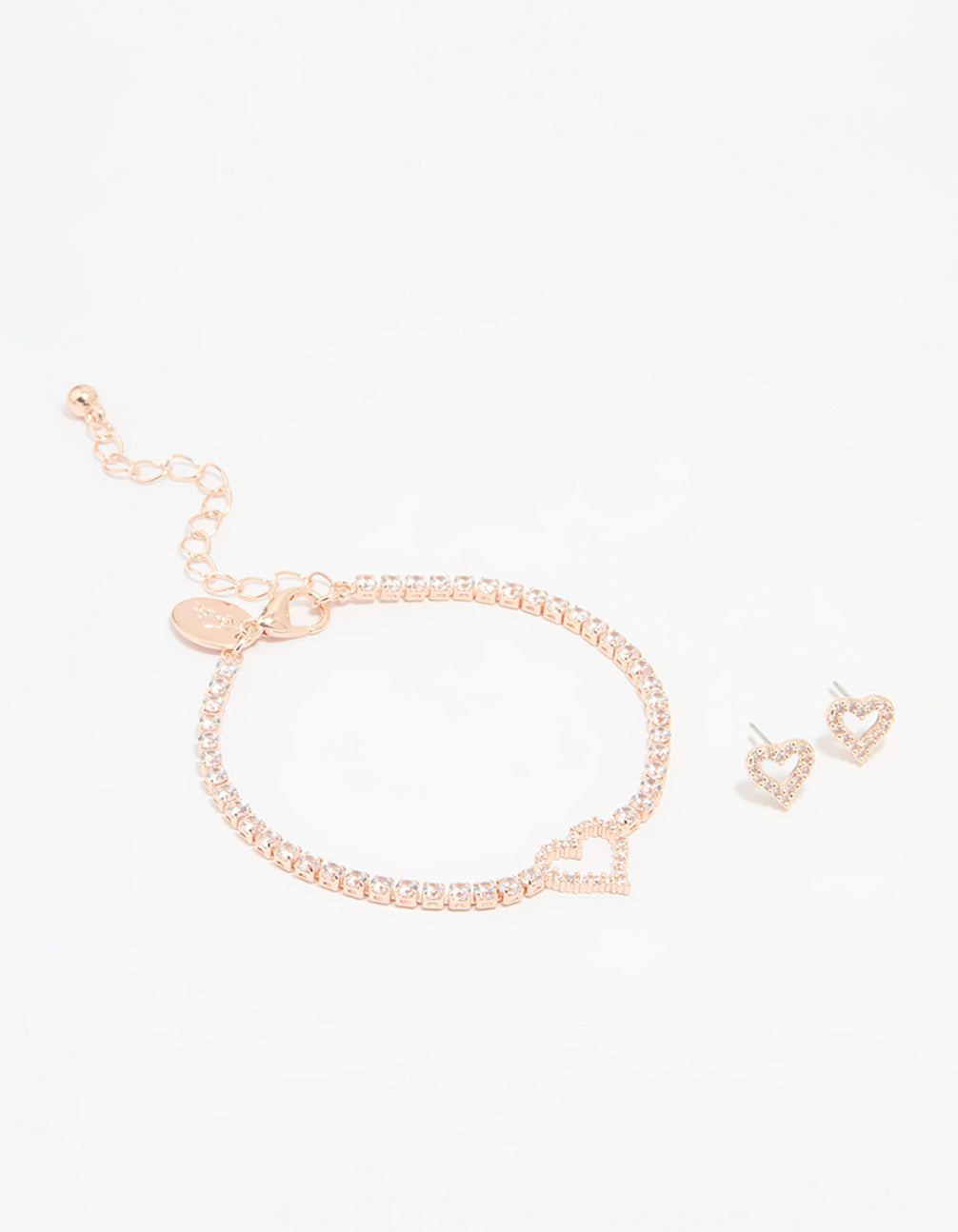 Rose Gold Plated Cubic Zirconia Heart Outline Tennis Bracelet & Earrings Set