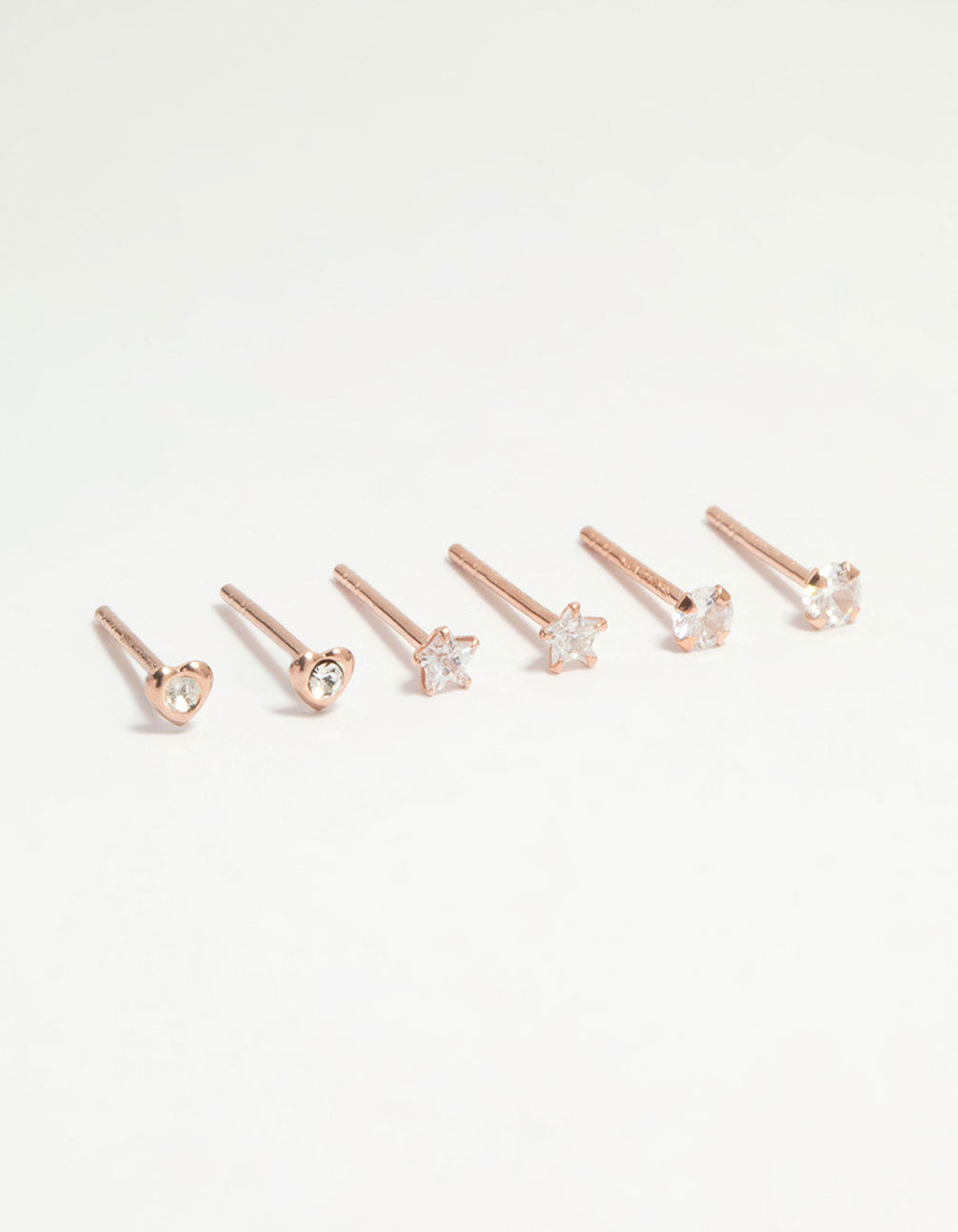 Add sparkle with our Rose Gold Plated Sterling Silver Diamante Tiny Stud Hoop Earrings 3-Pack! This set includes three pairs: heart-shaped studs with a diamante center, diamante studs, and diamante star studs. Perfect for everyday elegance!