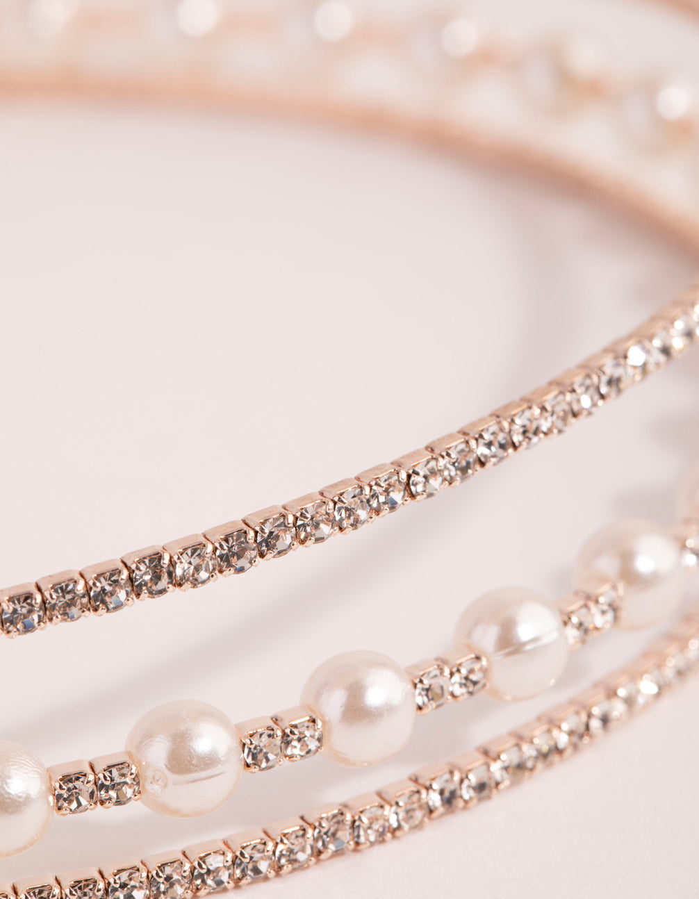 Rose-gold accessories are perfect for creating soft, pretty looks. This stunning choker features three tiered rows with a diamante embellishments. A line of faux pearls adorns the centre row. Layer it with other chains for maximum impact!