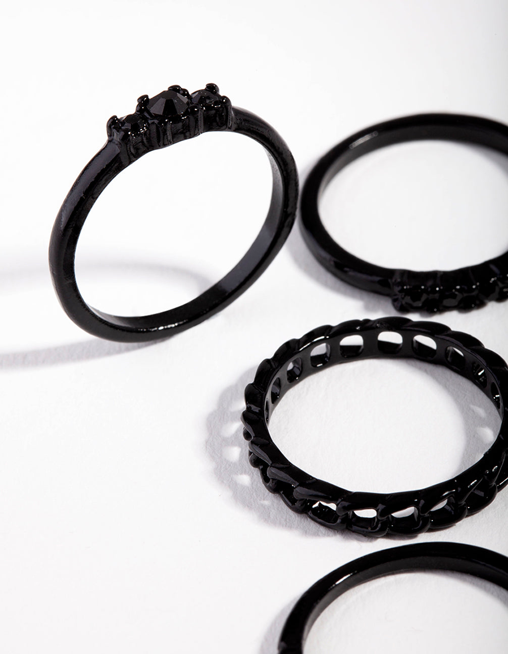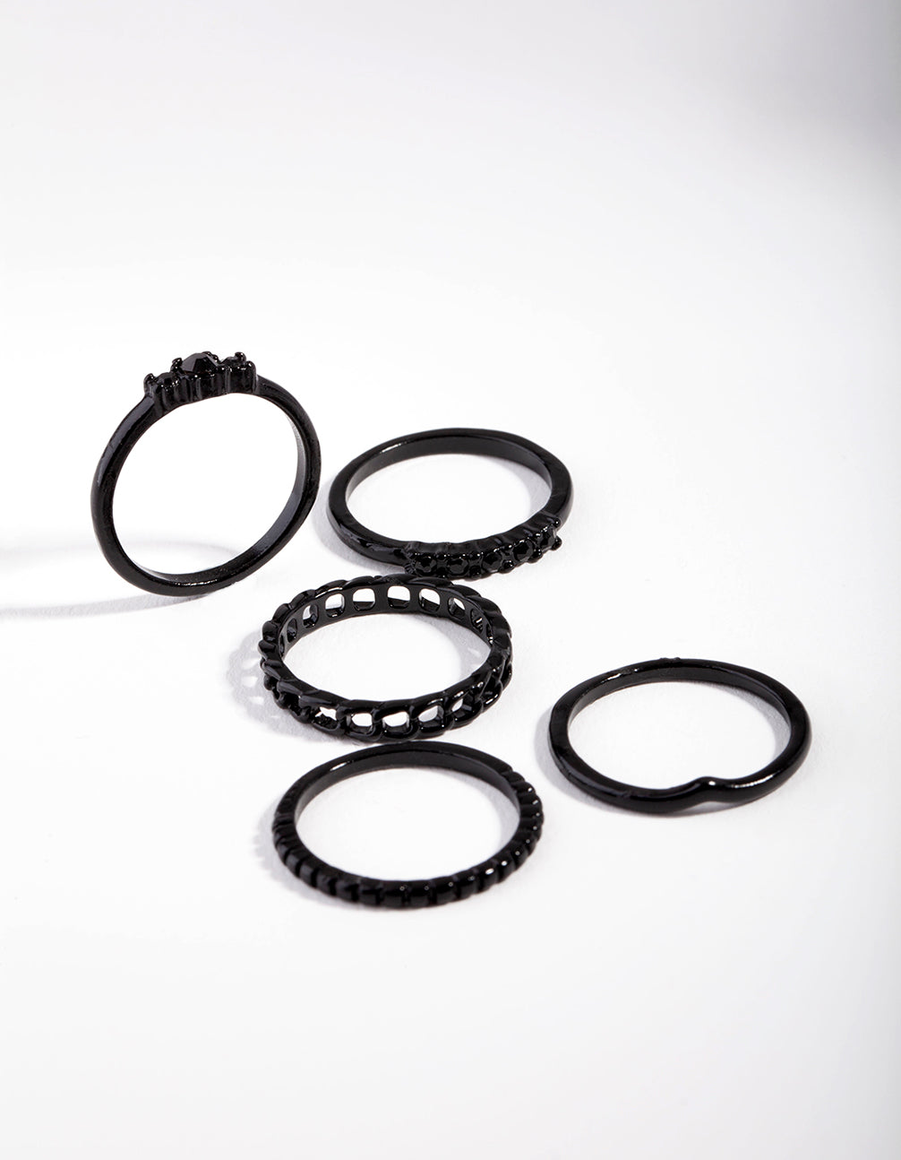 Mix and match with our ring packs! Stackable rings allow you to create your own personalised looks. This pack comes with a variety of black-toned styles featuring stunning diamante and chain designs.