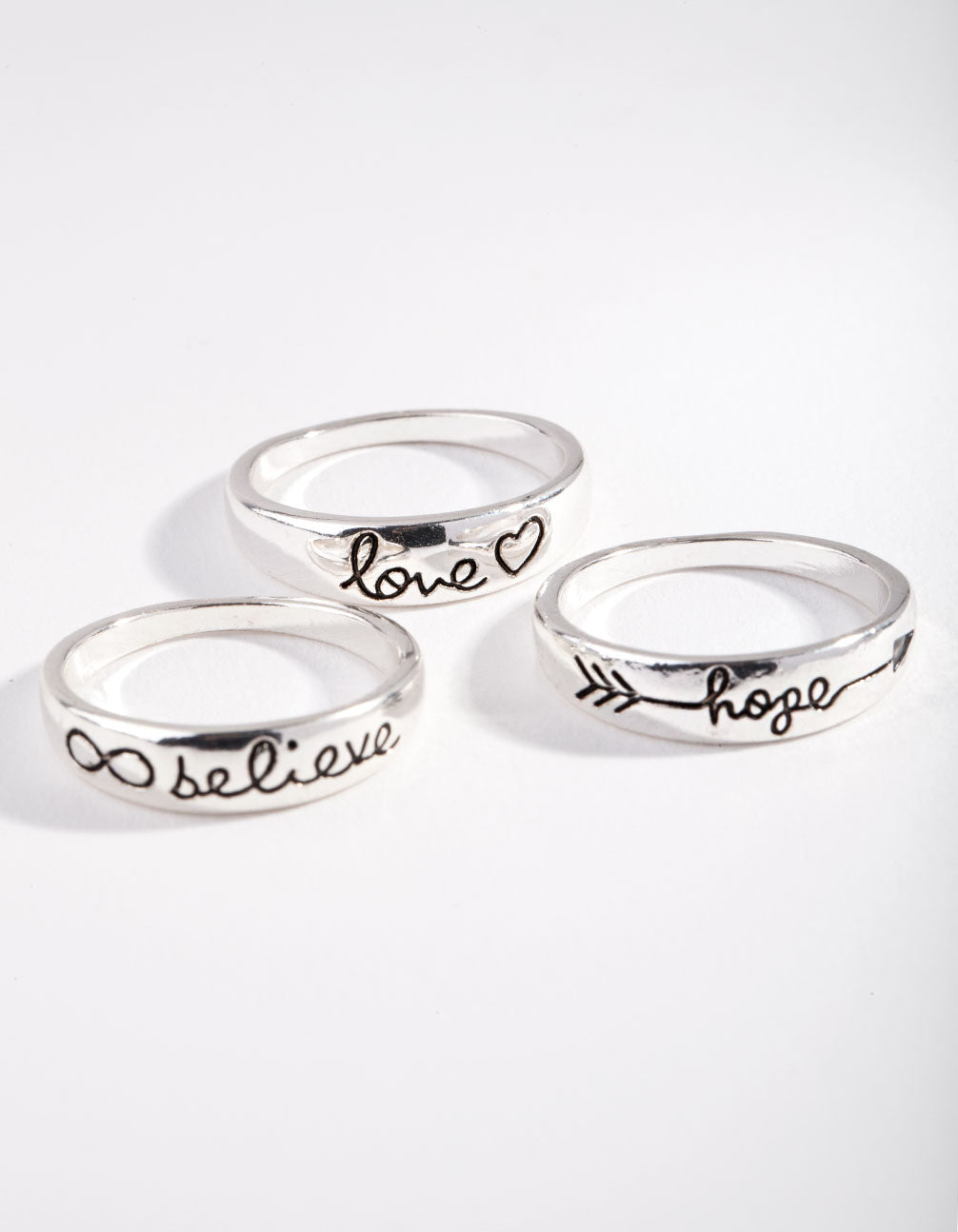 Start your stack with this modern ring set. Featuring a trio of silver-toned inspirational word designs, we love the idea of wearing this pack together, or mixing and matching with other rings in your collection.