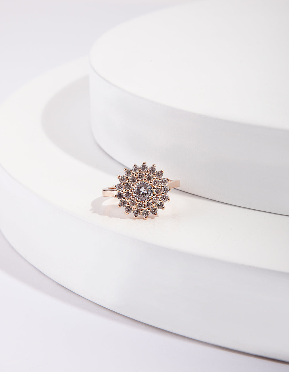 This ring boasts a gold-toned engagement style with cubic zirconia stones. Cubic Zirconia stones provide a luxury look without the high-end price point. Add some sparkle to your daily life!