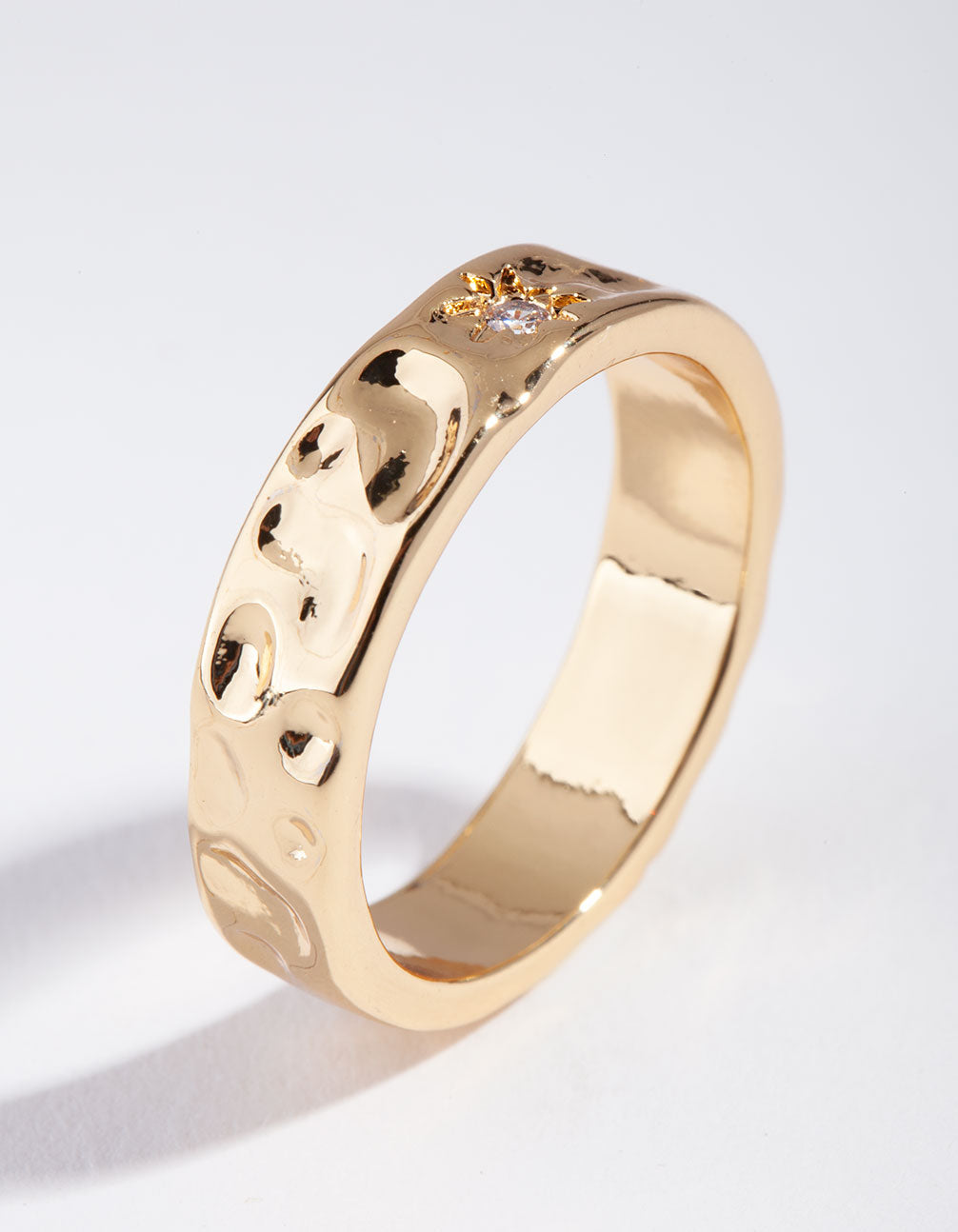 A collection of precious pieces made in the finest quality metal platings. This gold plated ring features a thin molten diamante star design and is perfect to wear on its own or stacked with other rings.