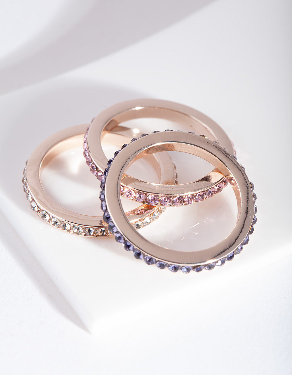 Make a statement in a stunning fashion ring. Stack with other styles for extra impact or wear alone for a refined addition to your ensemble. This ring stack comes in a rose-gold-tone with multi-coloured diamantes.