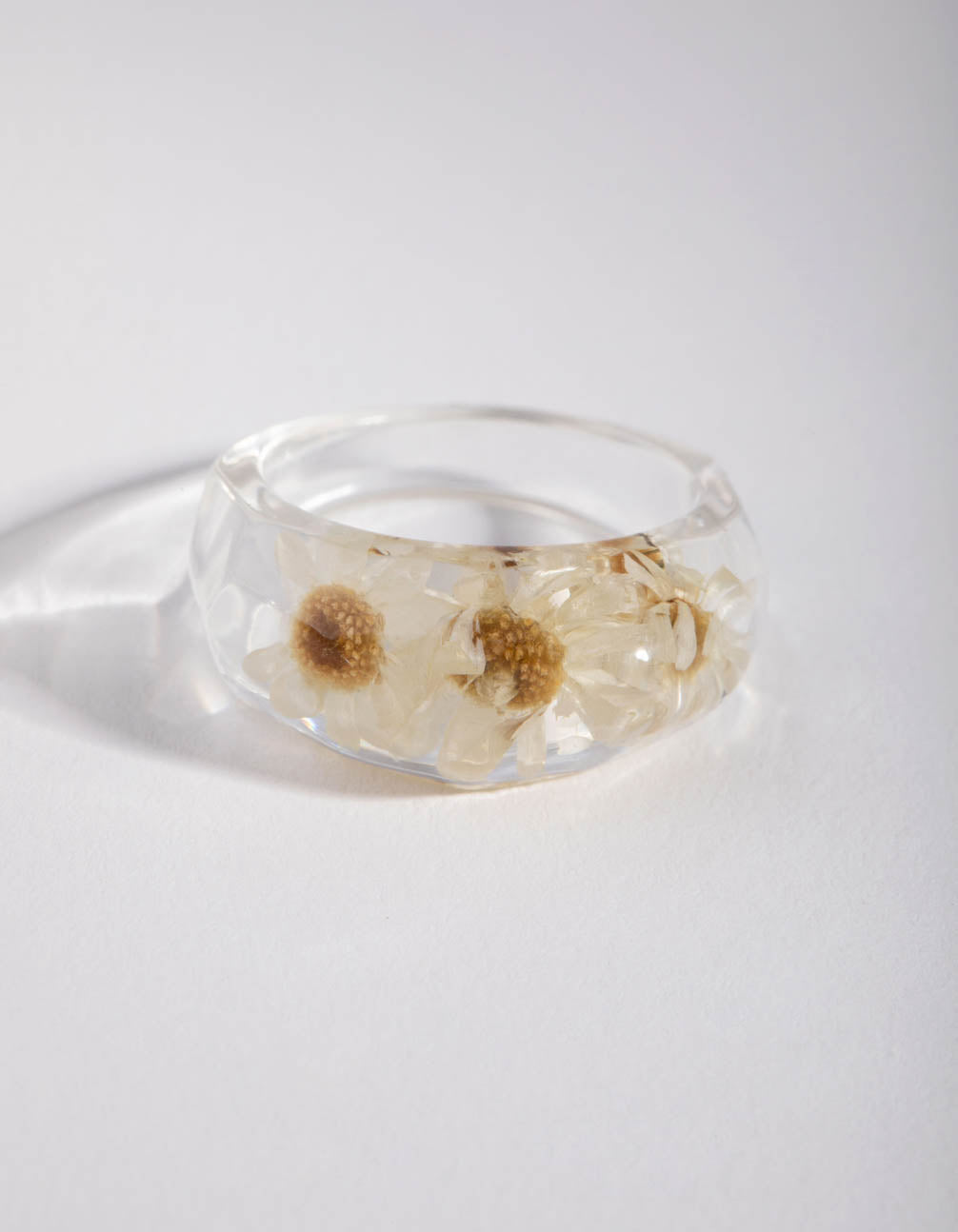 Elevate your ensemble with gorgeous fashion rings! This one is clear, and features three daisies at its centre. It has a decidely vintage vibe, wear it and channel another time!