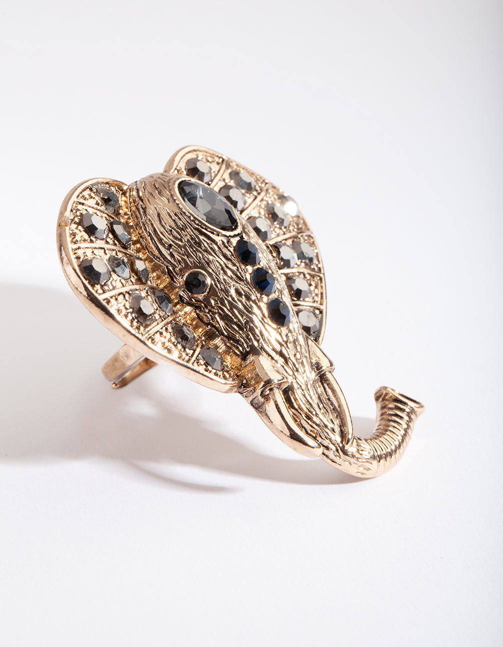 Make a statement in a stunning fashion ring. Stack with other styles for extra impact or wear alone for a refined addition to your ensemble. This ring features an elephant head design with black diamante embellishments.