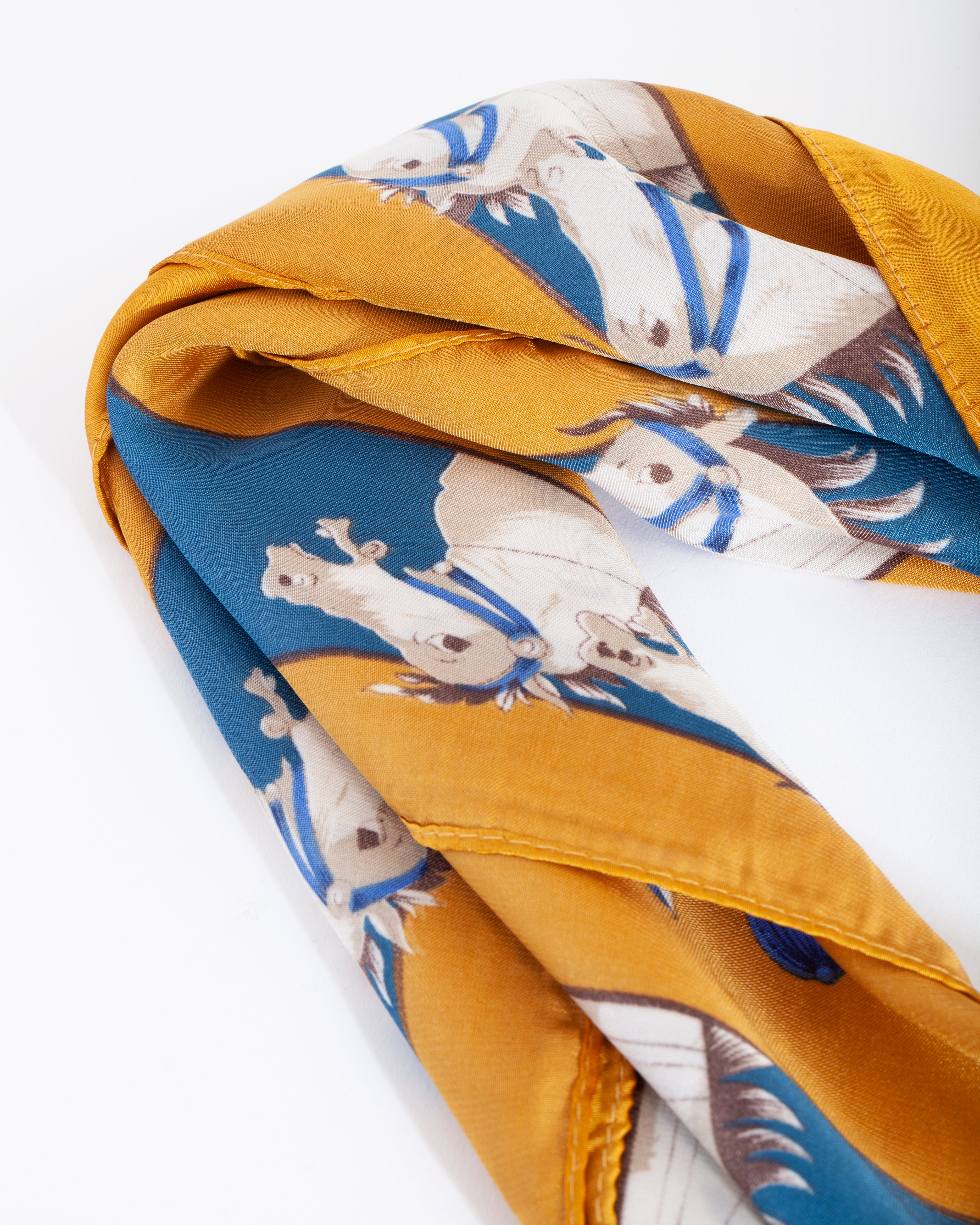 Playful and glamorous! Our hair accessories can dress up any outfit. This scarf comes with a mustard and blue horse design.