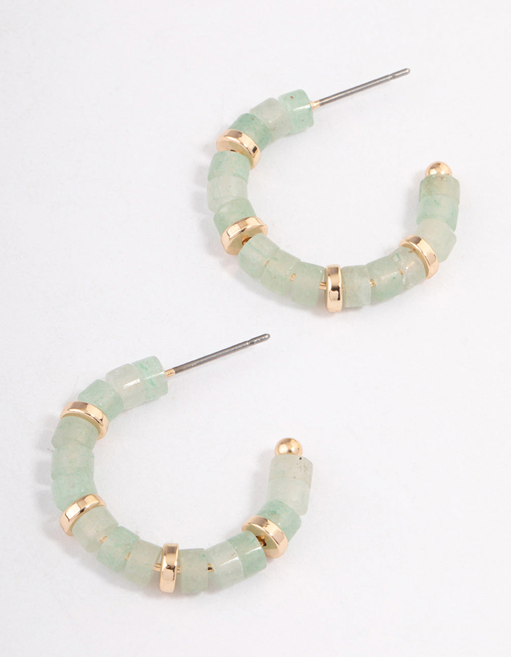 - Protect your energy with these green adventurine, beaded hoop earrings on a gorgeous gold setting. Green adventurine stones are said to help with strength, confidence and courage. Pair these hoops with a matching pendant necklace with a green adventurine stone for a natural finish.