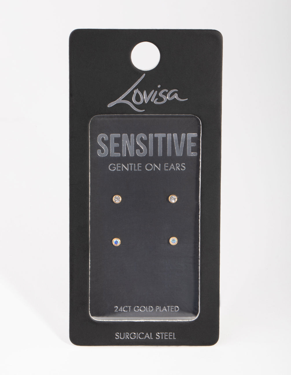 Designed with sensitive skin in mind, the Lovisa Sensitive Ears Collection utilises premium materials that reduce the risk of irritation. This set includes two stud earrings with eye-catching diamante embellishments. They're made from surgical steel and plated with genuine 24-carat gold.Lovisa is confident your ears will love the Sensitive Ears Collection. However, Lovisa offers an 100% money-back guarantee on any item from the Sensitive Ears Collection should the earrings cause irritation.
