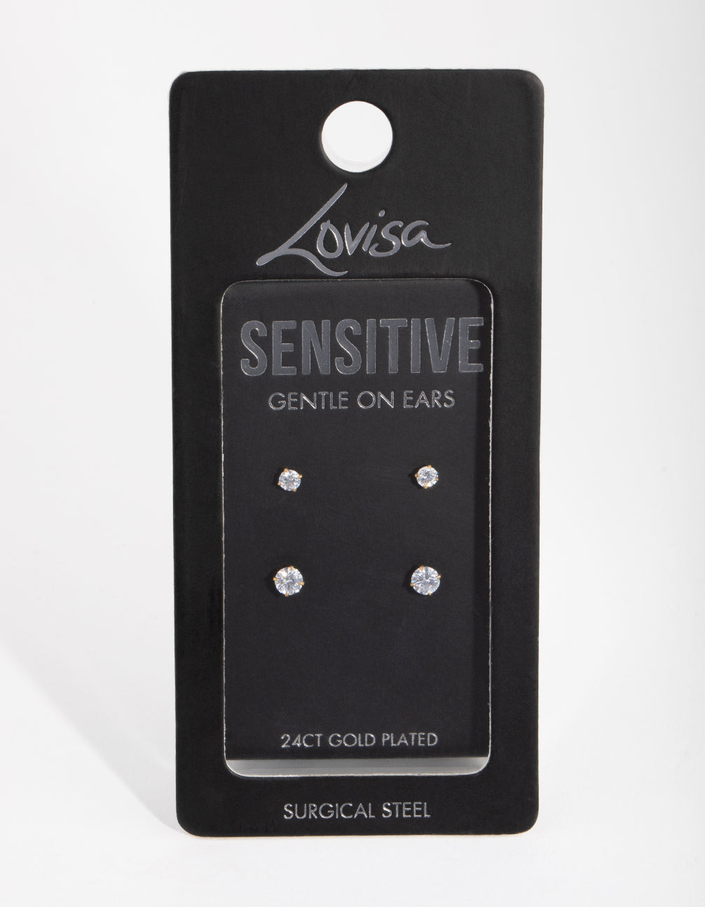 Designed with sensitive skin in mind, the Lovisa Sensitive Ears Collection utilises premium materials that reduce the risk of irritation. This set includes two pairs of dainty round earrings with cubic zirconia embellishment. Made from surgical steel and plated with genuine 24-carat gold, these are perfect to dress up any look for maximum impact.