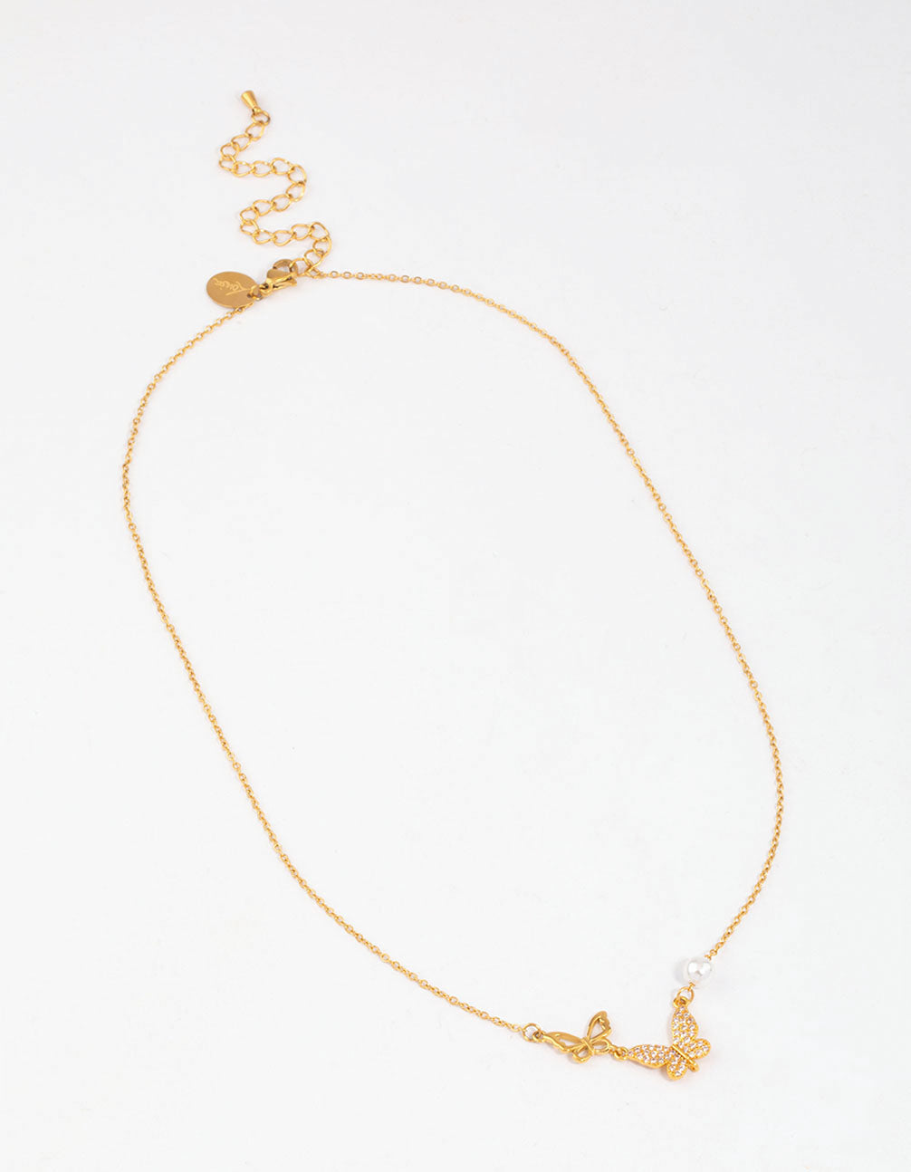 Gold Plated Surgical Steel Double Butterfly Pearl Pendant Necklace