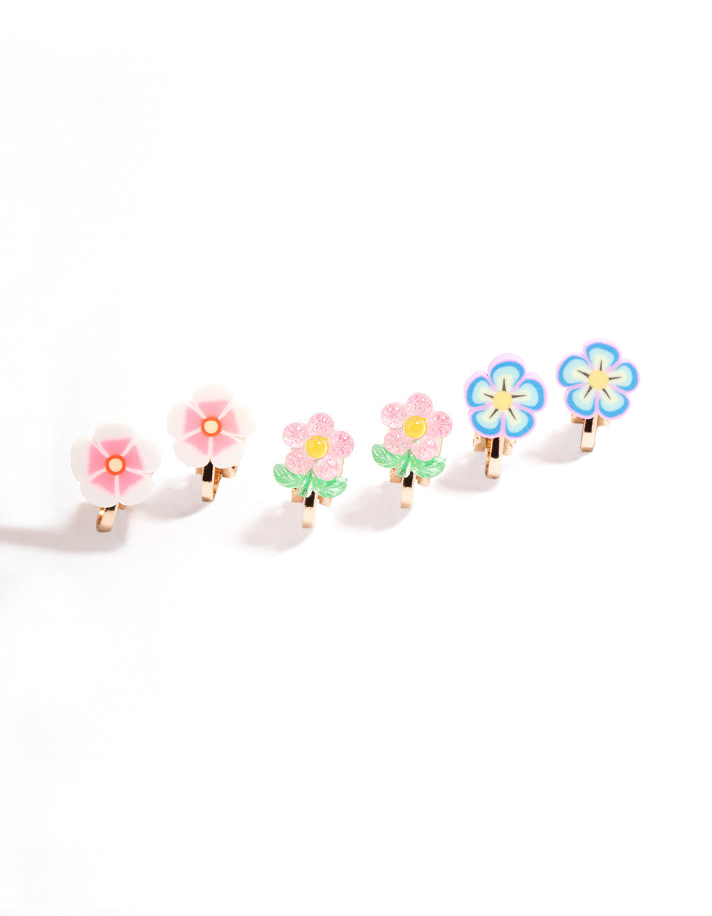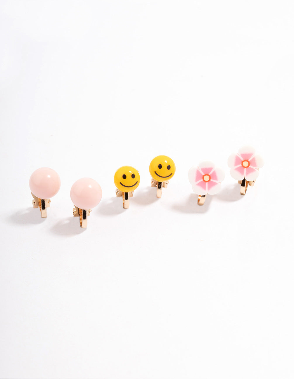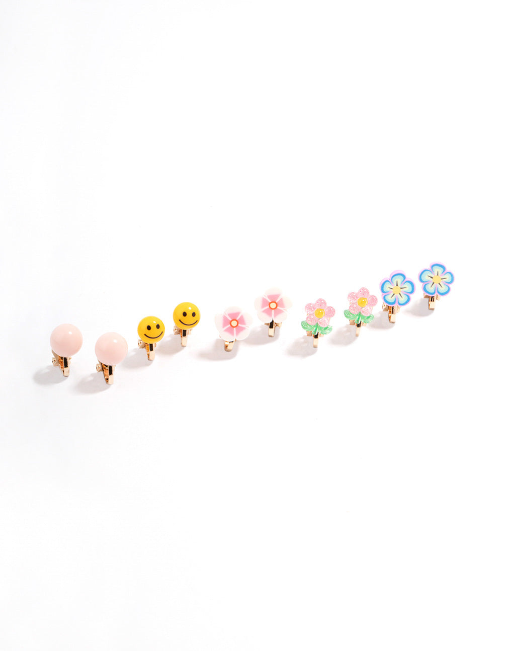- This ear stack contains five individual earrings and features smiley and floral motifs for an on-trend finish.