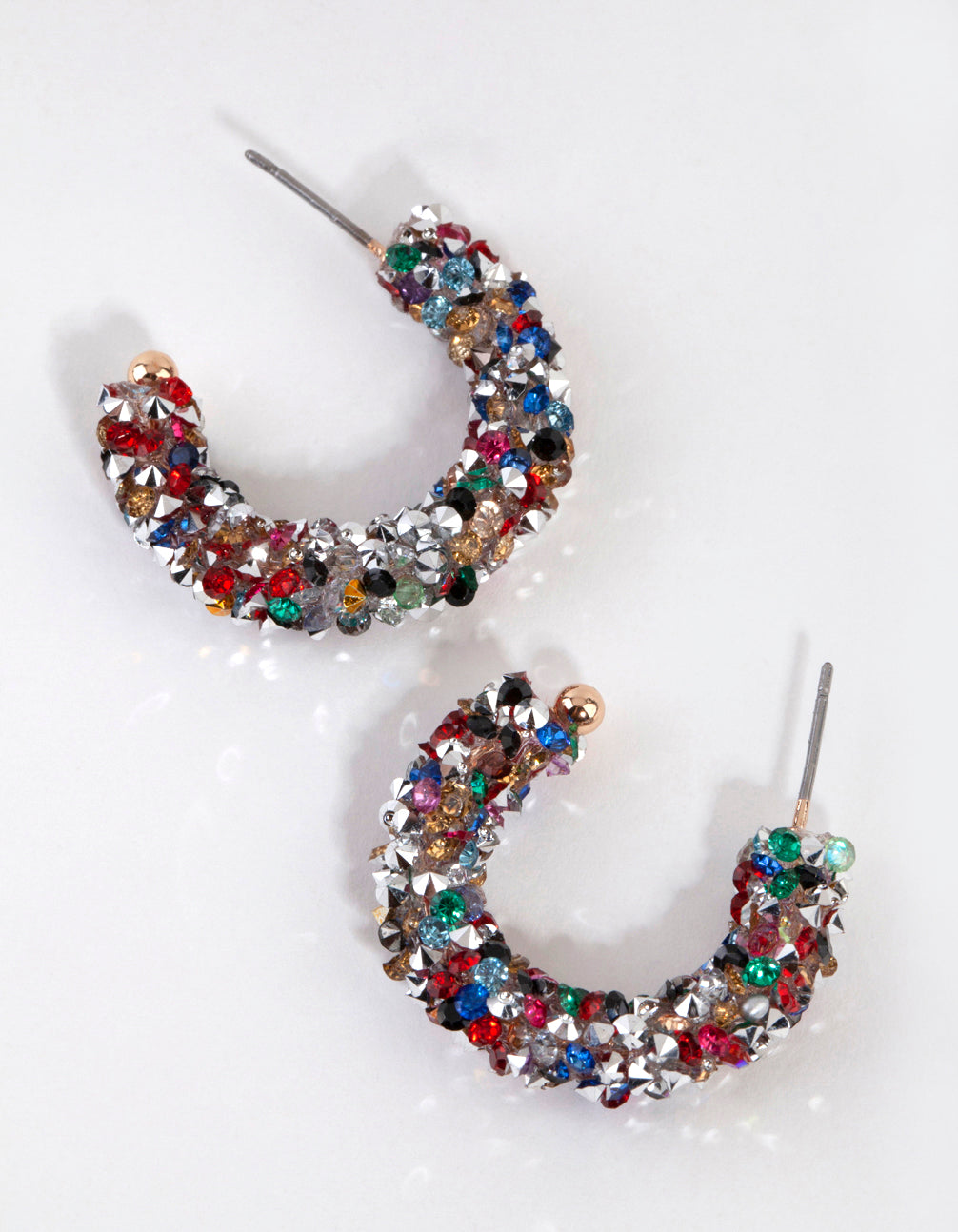 Pump up the glam with these glitzy hoop earrings! They feature a series of multicoloured diamantes on a silver setting.