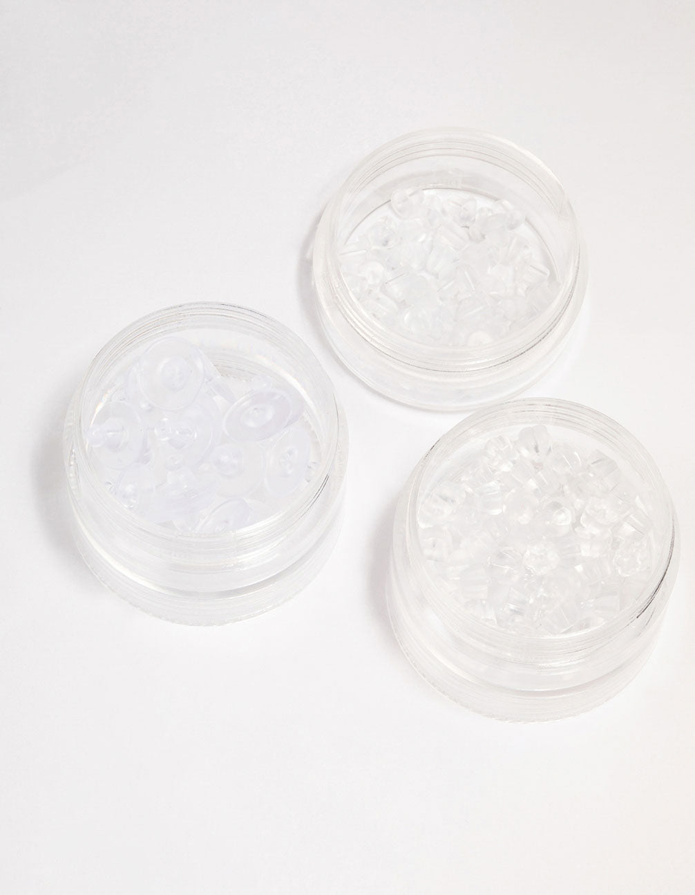 In need of an emergency earring back? Stock up with this set of three tubs, each filled with silicone earring backs. Perfect for keeping in your handbag, your desk and at your vanity!
