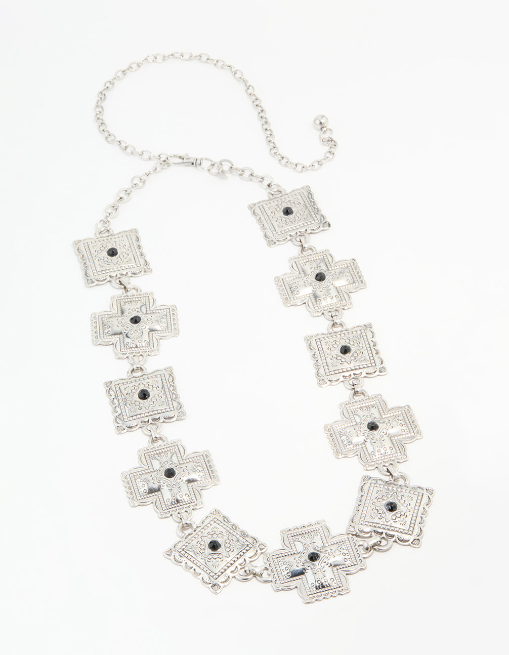 Elevate your outfit with this Silver Bohemian Square & Cross Belt. This belt features striking square and cross-shaped details in a sleek silver-tone finish and black beaded accents , giving it a unique, bohemian inspired vibe. Whether you're heading to a festival, grabbing brunch with friends, or simply adding a boho touch to your everyday look, this versatile accessory is your go-to. Pair it with flowing dresses, high-waisted jeans, or even layer it over a chunky knit for a laid-back yet polished feel. Ideal for anyone who loves bold and artistic accessories, this belt is here to make your outfit pop while keeping things chic and playful.