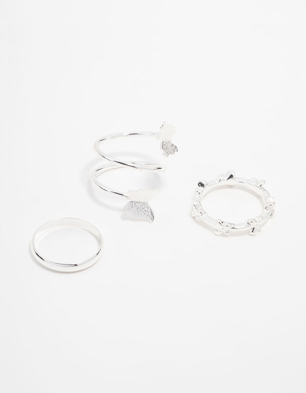 Mix, match, and stack for instant style! This set of three silver-toned rings features a wrap-around butterfly, a smooth design, and butterflies embedded in the band.
