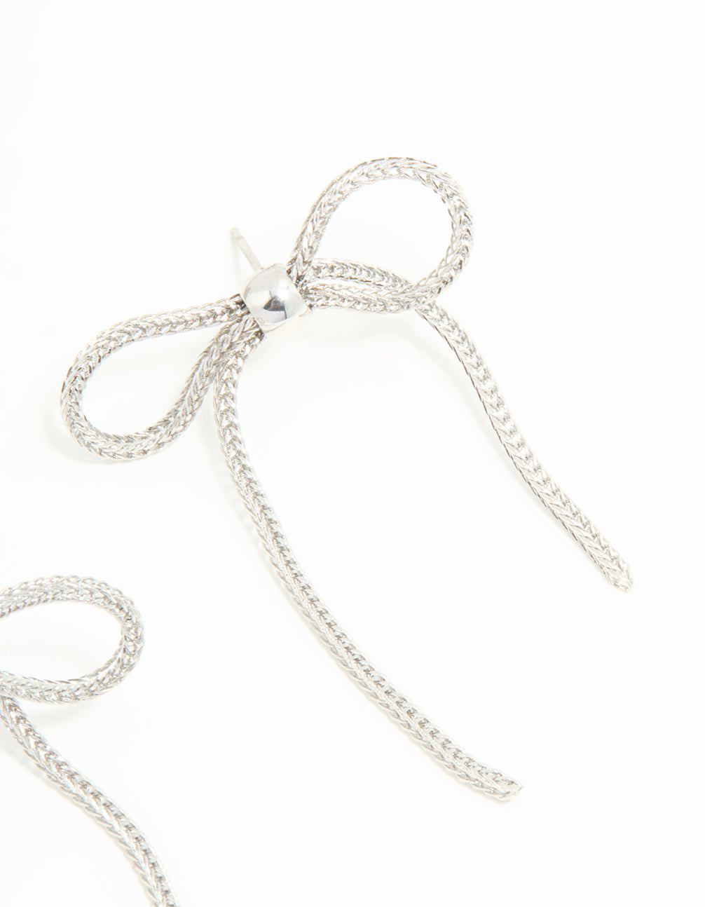 Add a touch of charm to your jewellery collection with these Silver Chain Bow Earrings. Featuring a delicate bow design paired with sleek silver chains, these earrings are a versatile choice for any occasion. Their drop style adds movement, making them a great pick for dressing up casual looks or adding flair to evening outfits. Crafted from quality silver plating, these earrings are lightweight yet striking, ideal for parties, dinner dates, or simply elevating your everyday style. Pair them with a flowing dress for a romantic vibe or a tailored blazer for a polished finish.