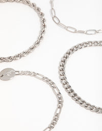 Add some serious style to your collection with this Silver Chain Bracelets Pack. This versatile wristwear set includes four unique silver chain designs, perfect for mixing, matching, or stacking to suit your mood. With their sleek silver finish and timeless appeal, these bracelets are ideal for everyday wear or adding a polished touch to your evening look. Pair them with a casual tee and jeans for effortless cool, or layer them with your favourite bangles for a more statement vibe. Whether you're heading to brunch, a night out, or simply upgrading your jewellery game, these silver bracelets are a must-have accessory that works with everything. Stylish, classic, and endlessly wearable, they'll quickly become your go-to for any occasion!