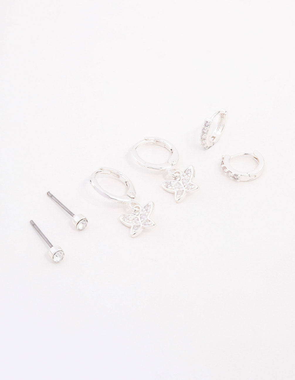 Rock the latest silver trends with this earring trio. Featuring classic diamante, whimsical butterflies, and sparkling cubic zirconia, these stylish studs are a must-have for your ear stack.