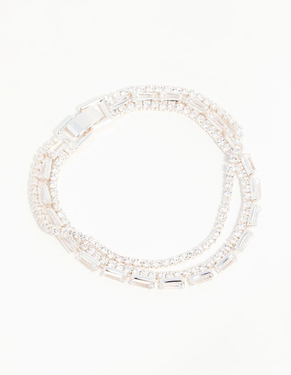 Upgrade your bridal look with this gorgeous layered bracelet. This stunning silver plated piece features shimmering chains and cubic zirconia crystals, perfect for adding sparkle to your special day.