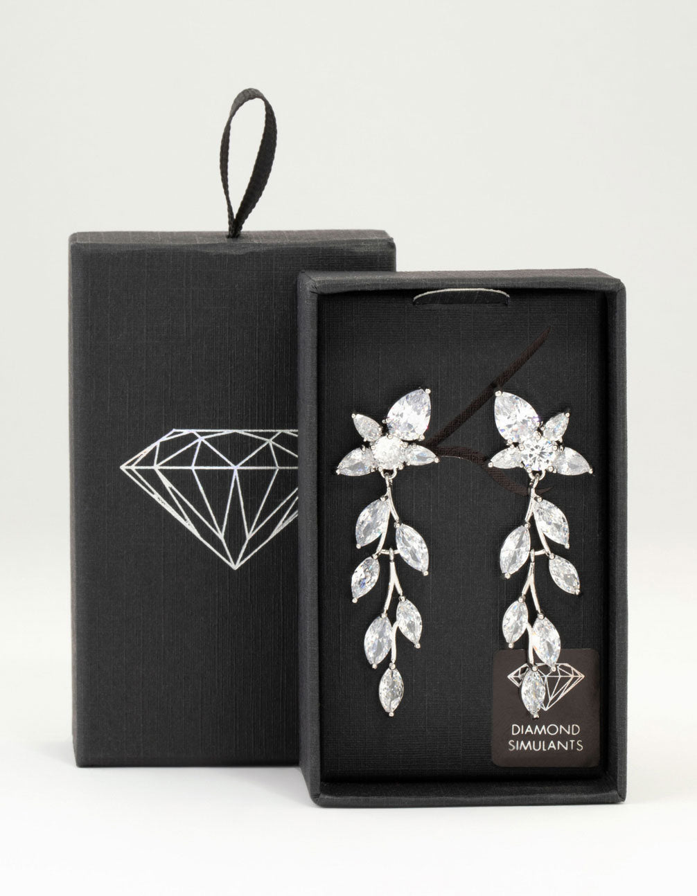 Silver Cubic Zirconia Leaf Flower Drop Earrings