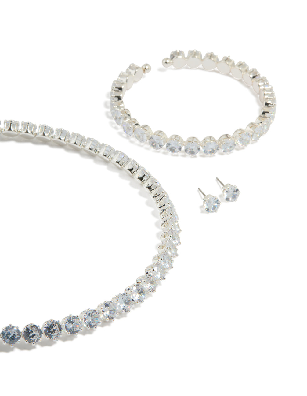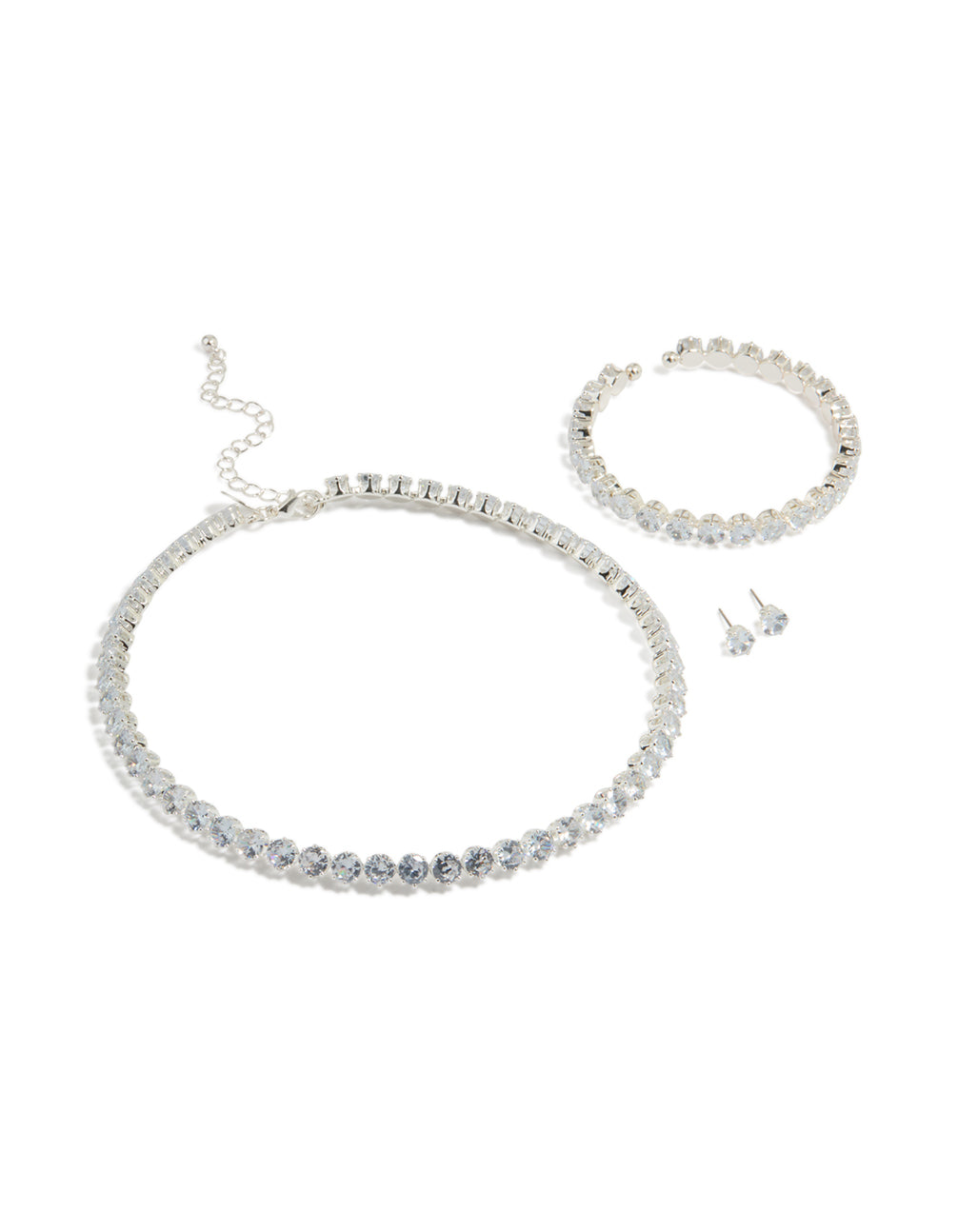 Elevate your sparkle game with this Silver Cubic Zirconia Navette Tennis Set! Featuring a sleek silver finish and dazzling navette-shaped cubic zirconia crystals, this jewellery set is perfect for adding a touch of elegance to any outfit. This set features a navette tennis necklace, a navette tennis bracelet and some classic stud earrings. The necklace makes a statement on its own, while the earrings and bracelet add subtle sophistication. Pair it with a flowing evening gown, a chic cocktail dress, or even a tailored blazer for an effortlessly polished vibe. This set is a must-have for anyone who loves timeless, versatile jewellery with a modern twist!