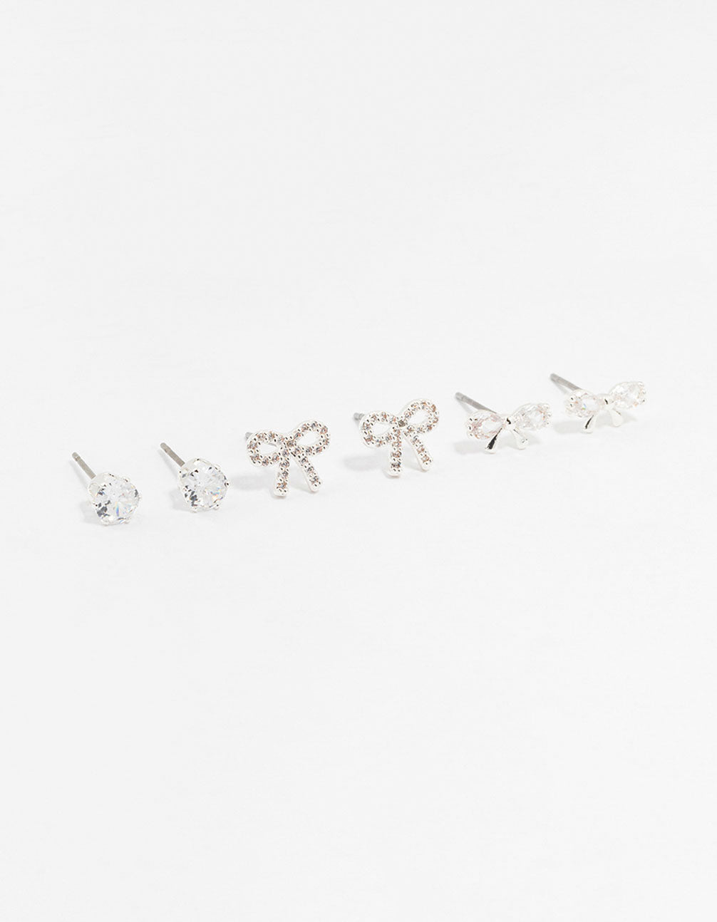 Add a touch of flirty coquettish charm to your look with this charming earring pack! It includes three stud pairs: simple cubic zirconia studs, cubic zirconia encrusted bows, and plain silver bows.
