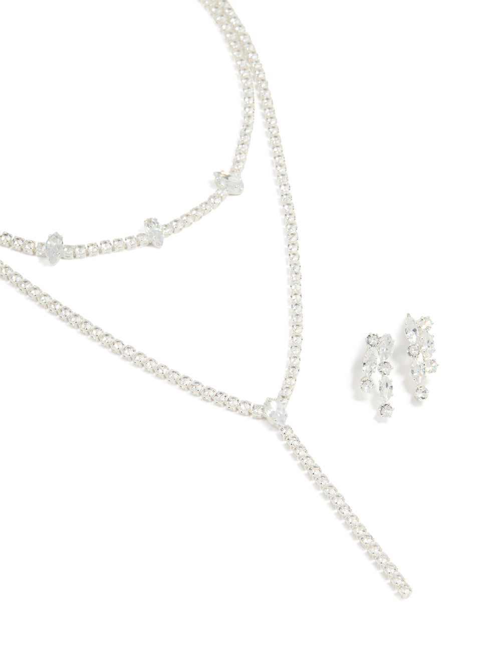 Silver Cubic Zirconia Y-Necklace & Drop Earrings Set