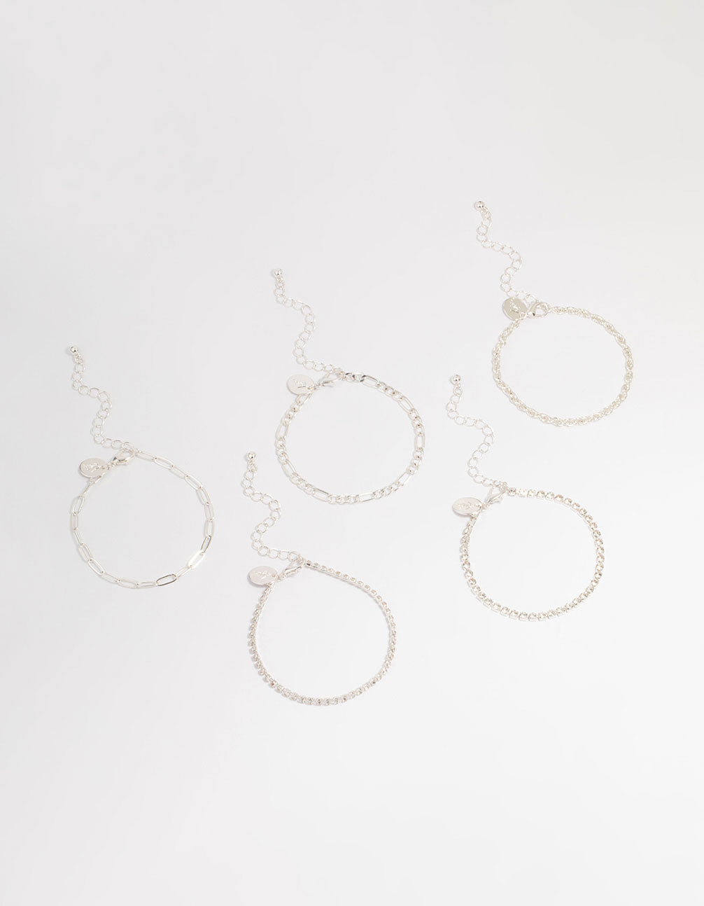 Add a touch of shine to your outfit with this Silver Cupchain Figaro Bracelets Pack. This stunning stackable set includes five unique designs, blending link chain, classic chain, and tennis bracelet styles. Crafted in a sleek silver-toned finish, these bracelets are perfect for mixing and matching or wearing solo for a minimalist vibe. Whether you're heading to brunch, a party, or just elevating your everyday look, this versatile wristwear pack has you covered. Pair them with your favourite rings and earrings for a coordinated finish or layer them up with other jewellery for a bold, statement style. From casual denim days to chic evening outfits, these bracelets add effortless elegance to any wardrobe. A must-have for anyone who loves modern, stackable jewellery!