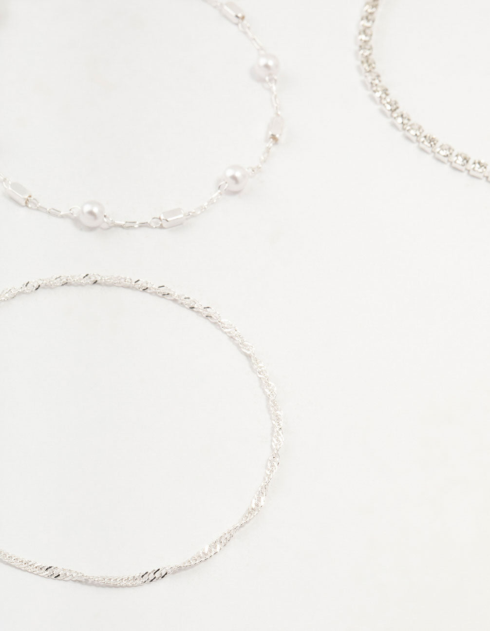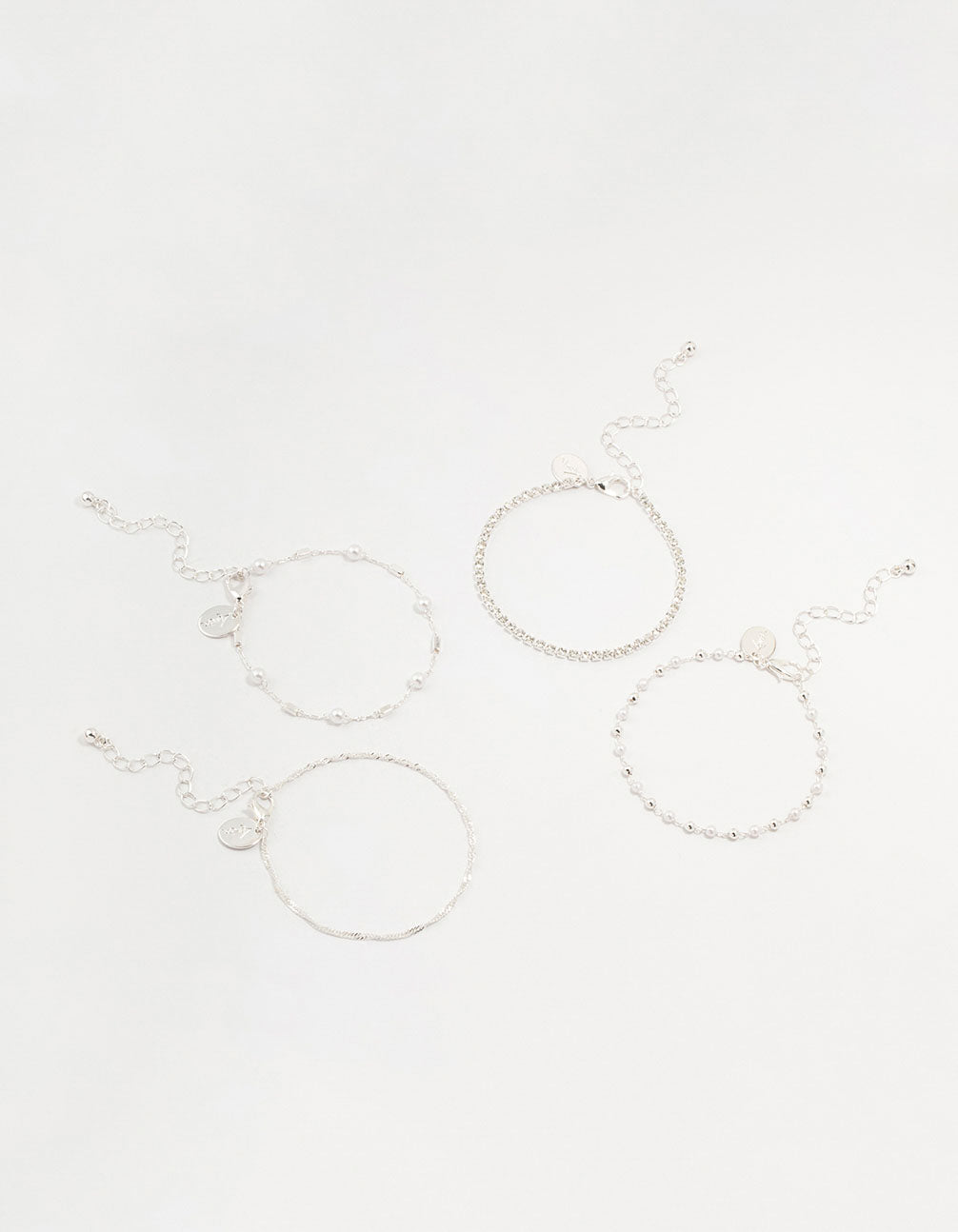 Curate a polished look with this stunning set of silver bracelets and anklets. This set features pearl, diamante and chain designs, perfect for adding a chic vibe to any look.