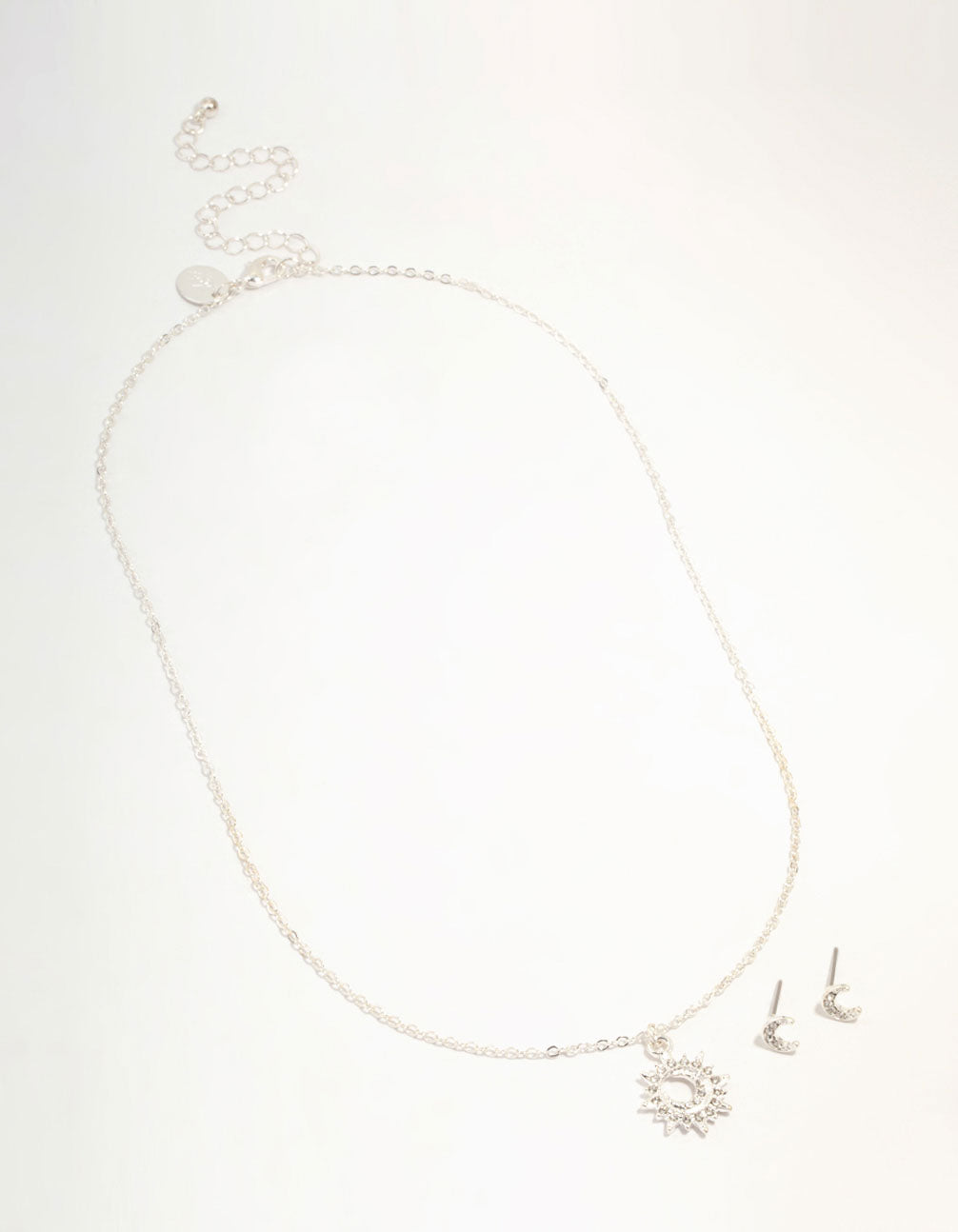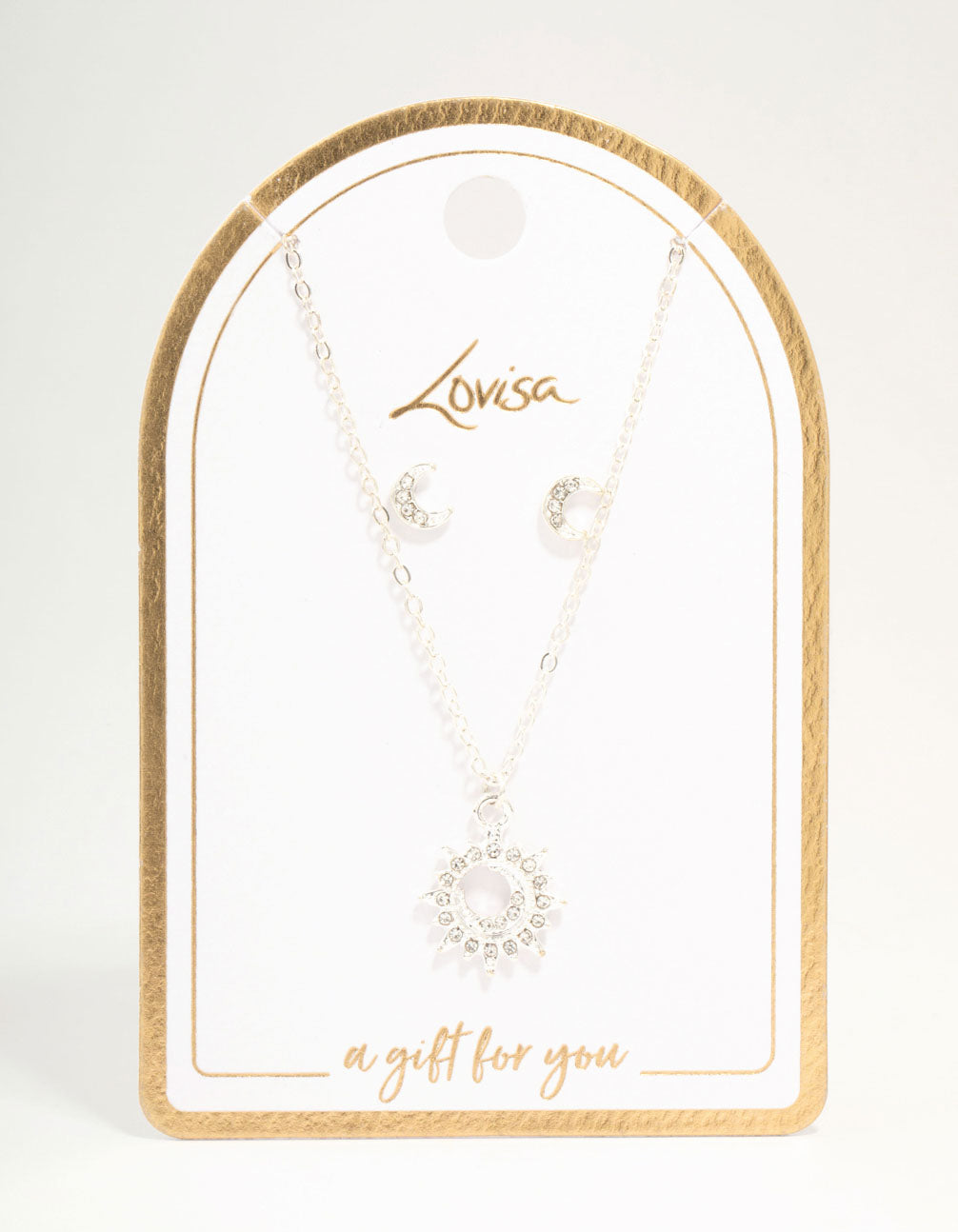 Gift them an out-of-this-world treat with this celestial necklace and earrings set. Featuring a silver toned pendant with a sparkling diamante encrusted sun and moon, plus dazzling moon studs, this set is simply stellar.