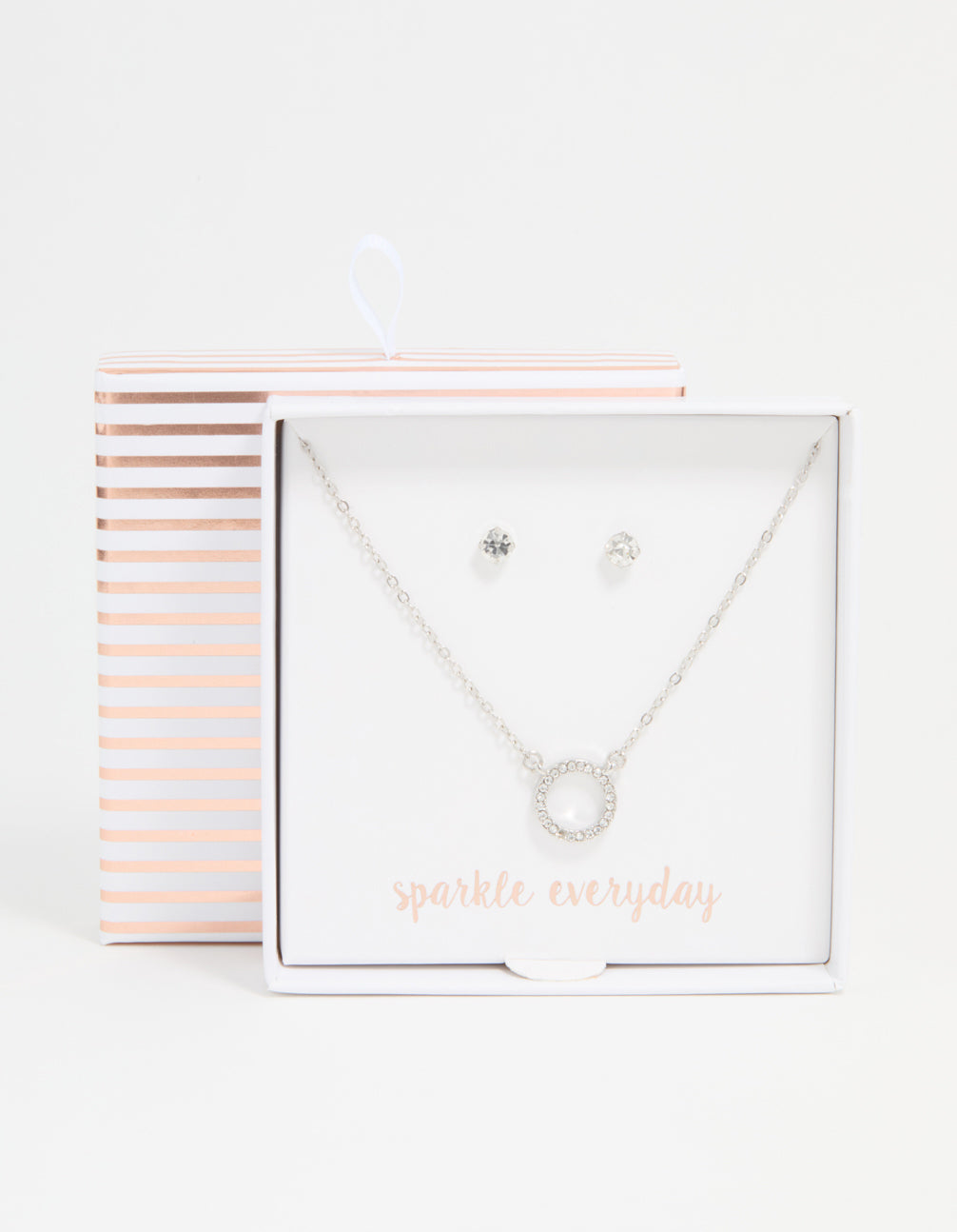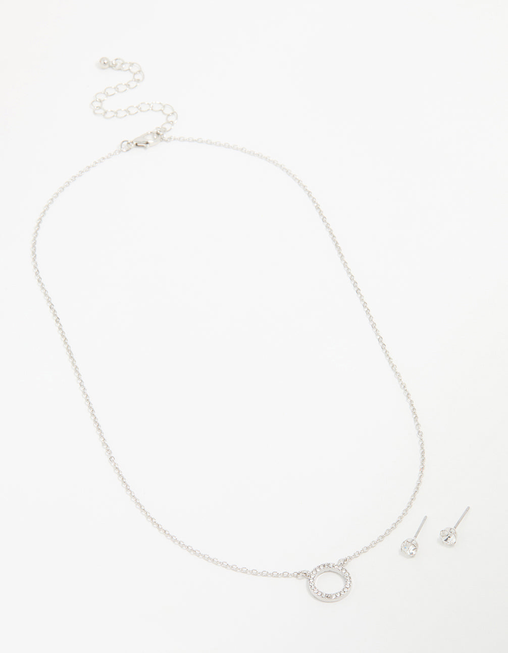 Silver Diamante Circle Pendant Necklace & Stud Earrings Set