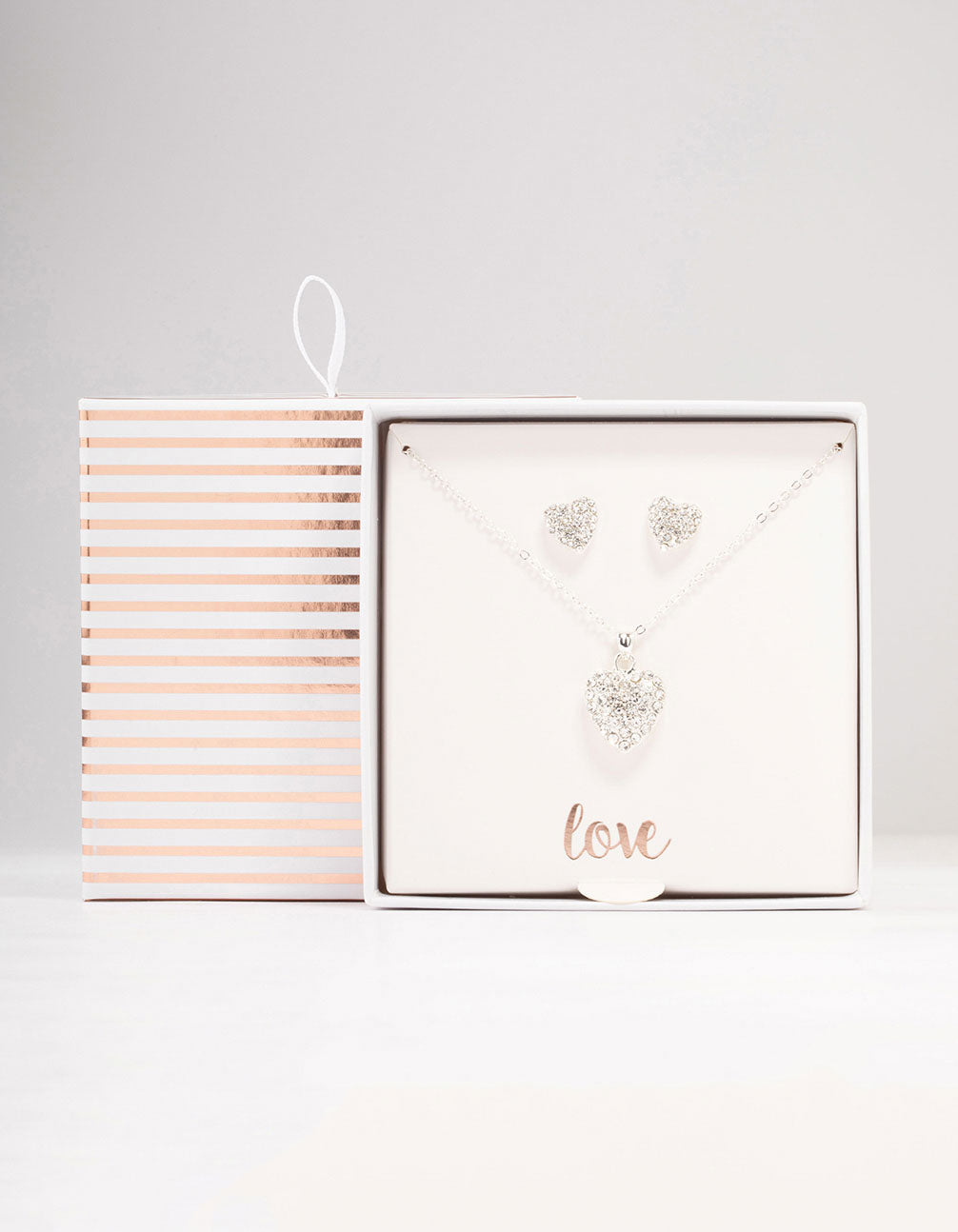 Discover our elegantly wrapped Gifting Collection for memorable moments. This stunning heart necklace and earring set is a gift to be treasured. The delicate silver chain features a sparkling diamante heart pendant with matching stud earrings.
