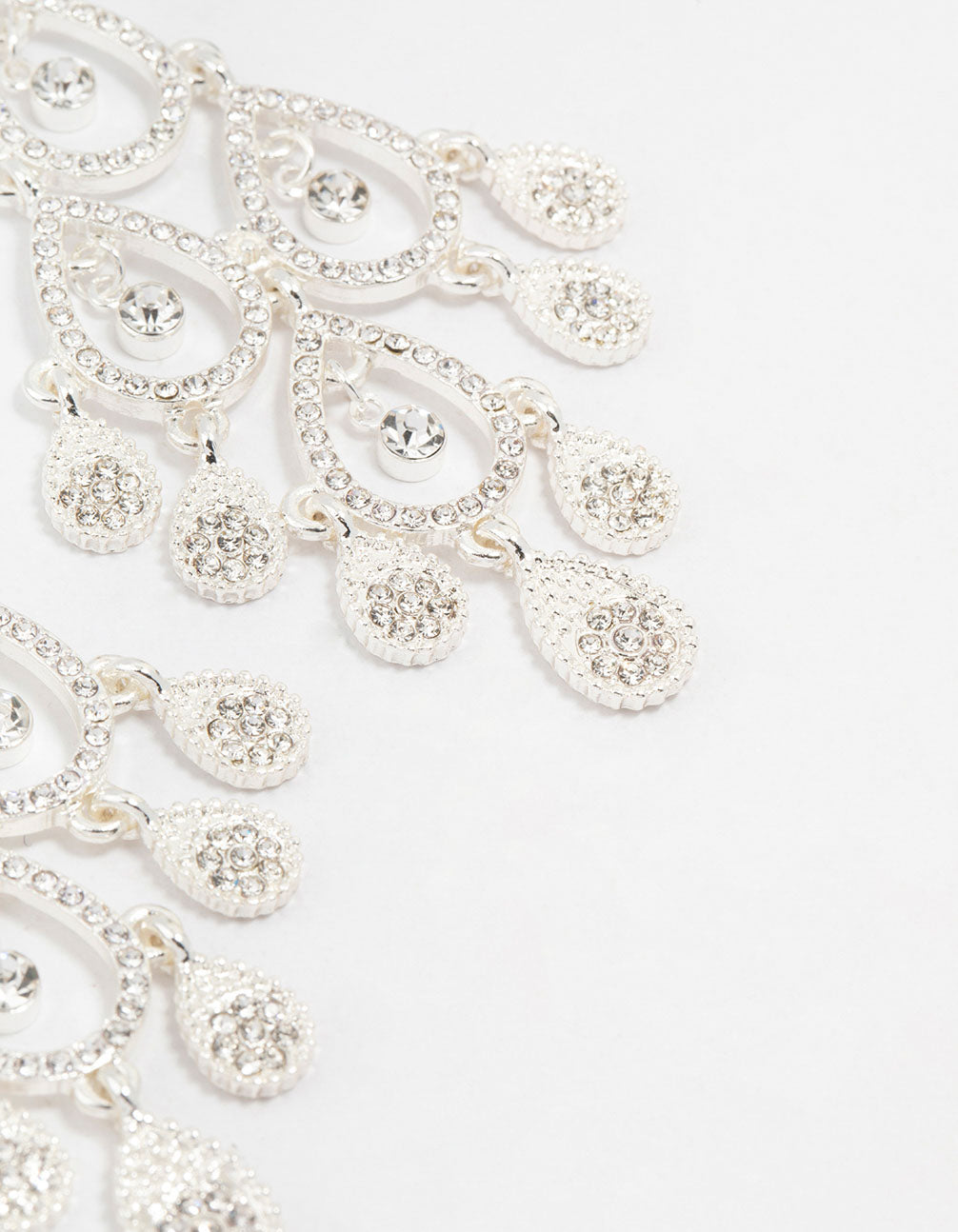 These elegant drop earrings feature a high shine silver tone finish and dazzling clear diamante stones in an open drop design that catches the light beautifully.