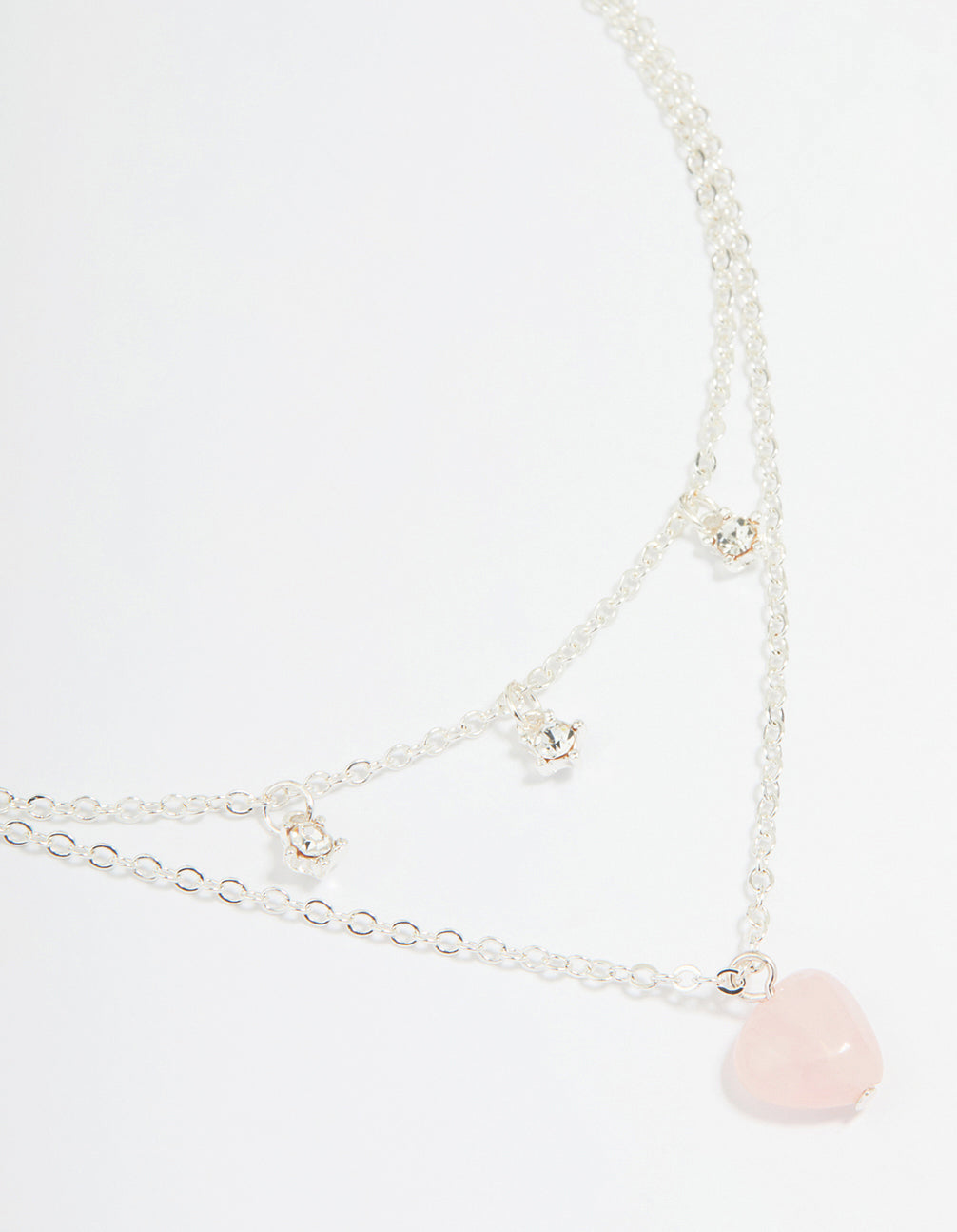 Silver Diamante & Pink Stone Heart Layered Necklace