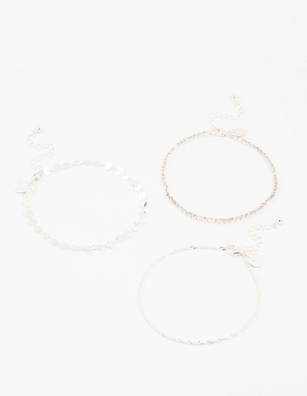 Upgrade your ankle game with this 3-pack of silver disc and cupchain anklets. Mix and match these classic styles to create your signature look—from boho-chic to minimalist-cool, they're versatile accessories that elevate your everyday style.