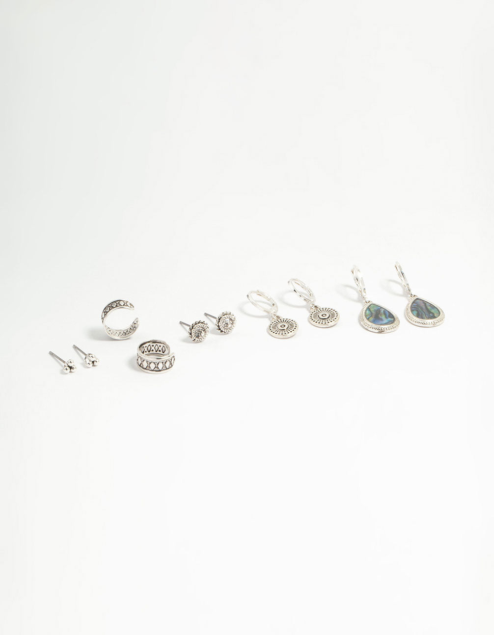 Add a touch of effortless charm to any outfit with this Silver Etched Drop & Stud Earrings Pack. This versatile earring pack includes intricate etched drop earrings, patterned hoop earrings, a playful ball cluster stud pair, and a pair of vibrant blue and green drop earrings. Perfect for mixing and matching, this set is ideal for everything from casual brunches to evening parties. Pair them with a flowy dress or your favourite jeans and a tee for a polished, on-trend look.
