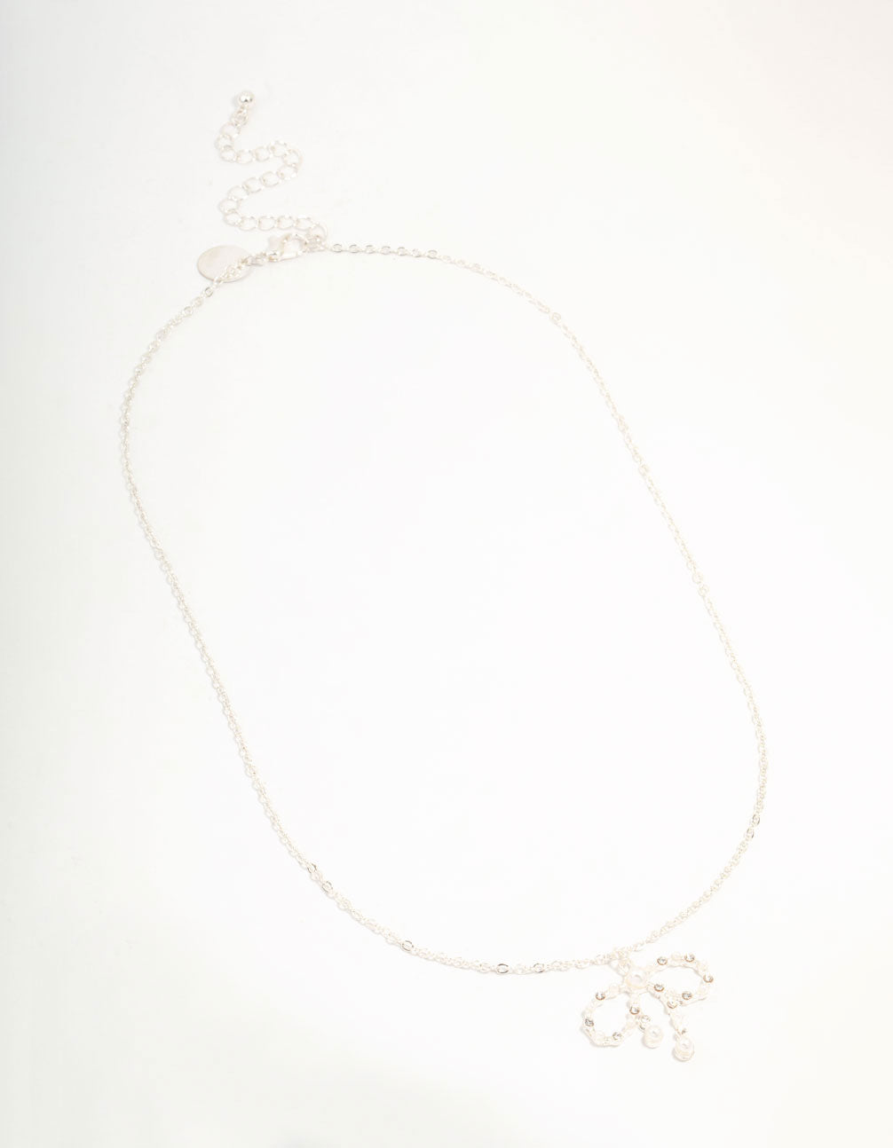 Upgrade your style with the charming Silver Pearl Bow Pendant Necklace. This stunning piece features a shimmering silver bow adorned with delicate pearls, perfect for adding a touch of coquette elegance to any outfit.