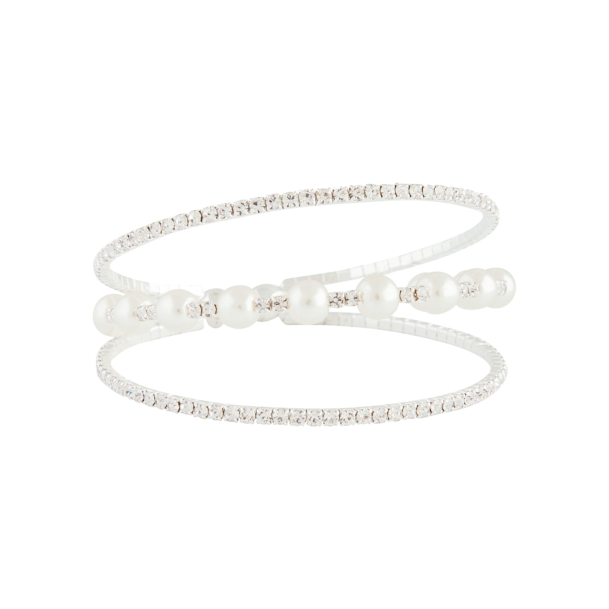 Three intricate layers of silver toned diamantes and pearls make up this evening wear piece. Wear on the wrist for a classic look, or further up on the arm for a trendy statement.