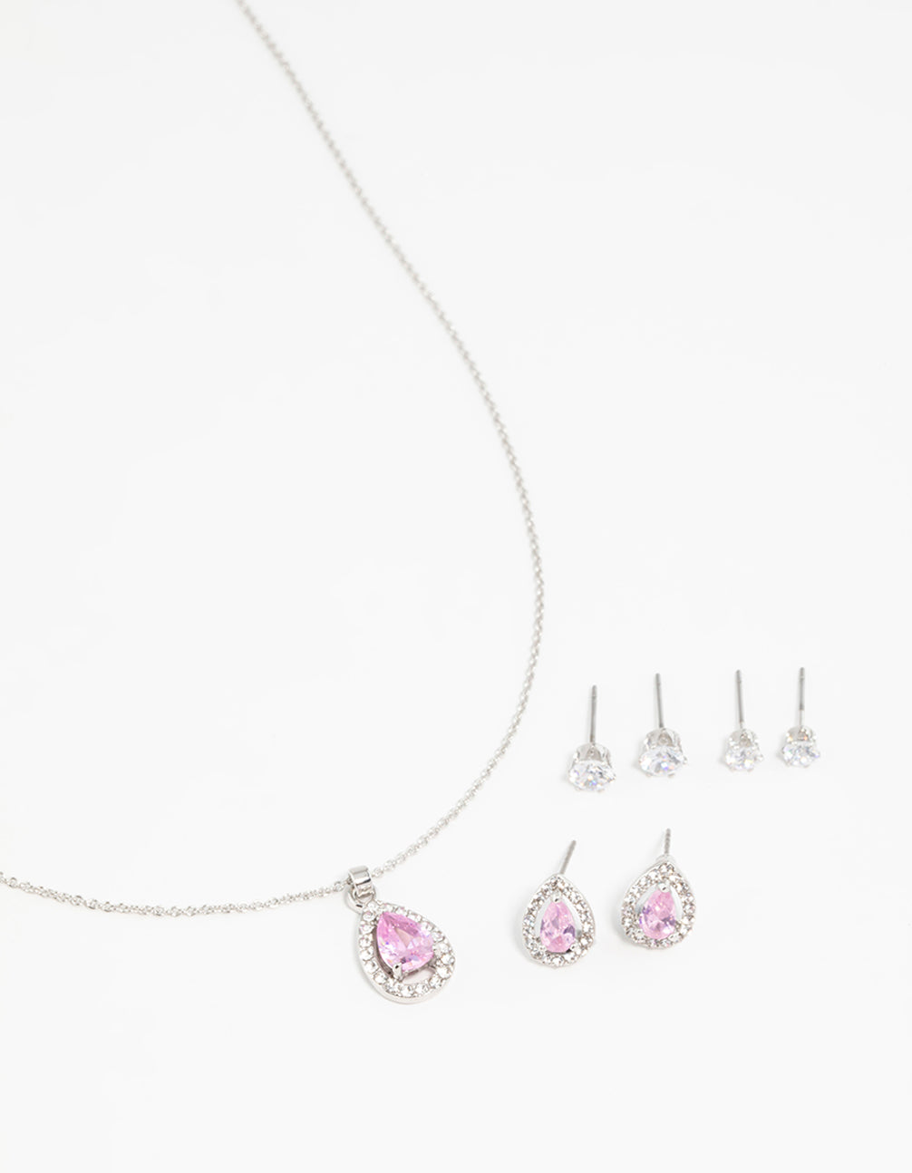Silver Pink Cubic Zirconia Drop Necklace & Stud Earrings Set Silver Pink Cubic Zirconia Drop Necklace & Stud Earrings Set Silver Pink Cubic Zirconia Drop Necklace & Stud Earrings Set