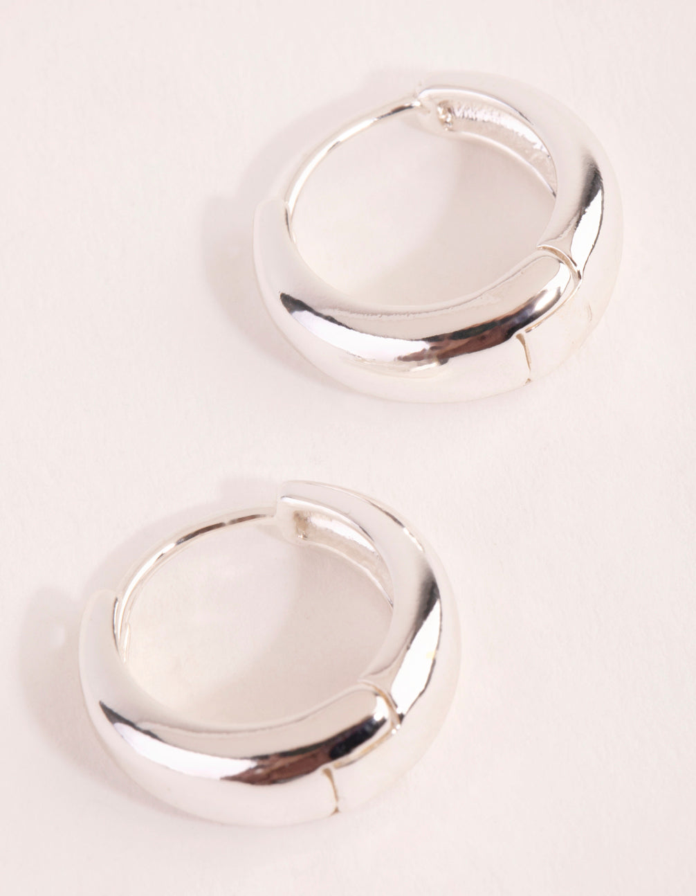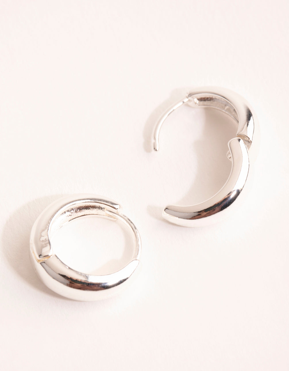 These lovely huggies are silver toned, and boast a wide hoop design in a dainty size. Too cute! Stack them with others or let them stand alone.