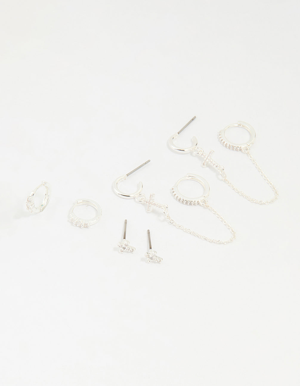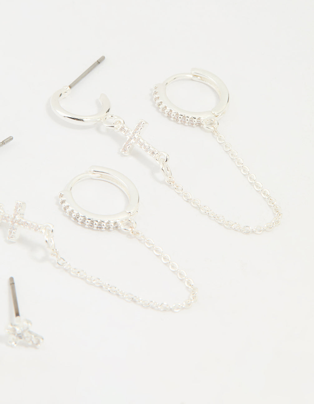 Silver Plated Brass Cubic Zirconia Cross Stud & Chain Earrings 4-Pack